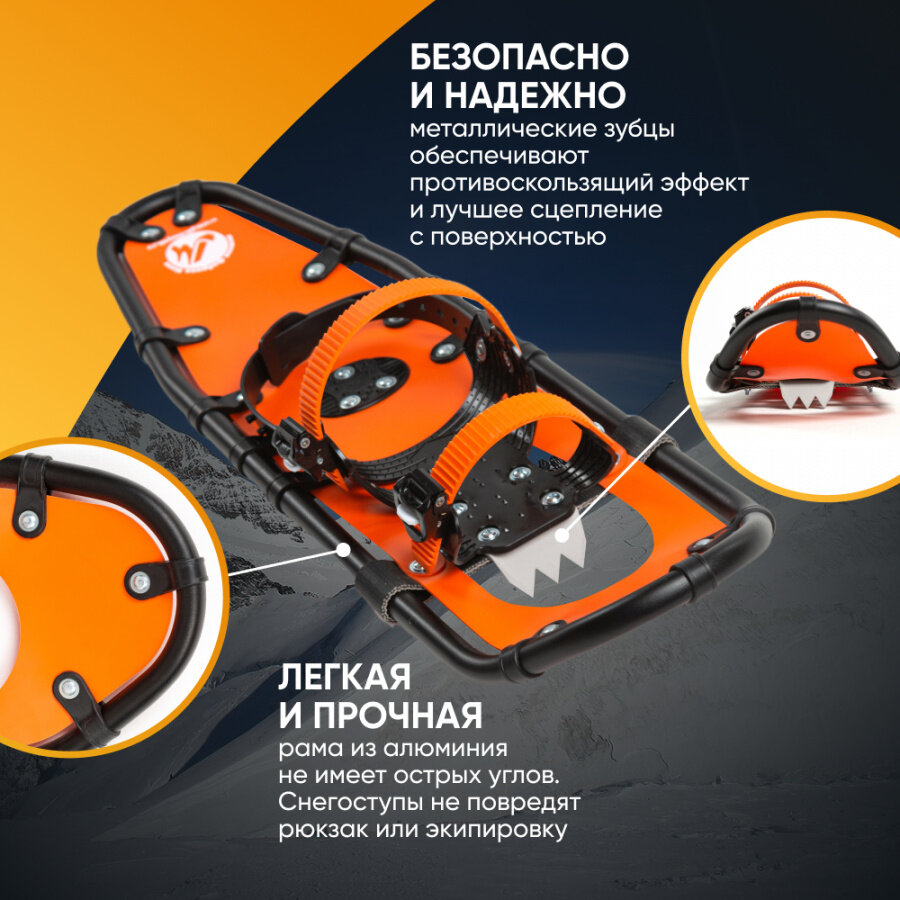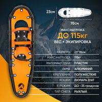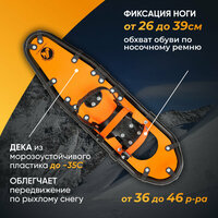 Размер подбирается исходя из веса и эргономических особенностей человека. В среднем снегоступы имеют размеры: по ширине 20-23 см и по длине 65-75 см.