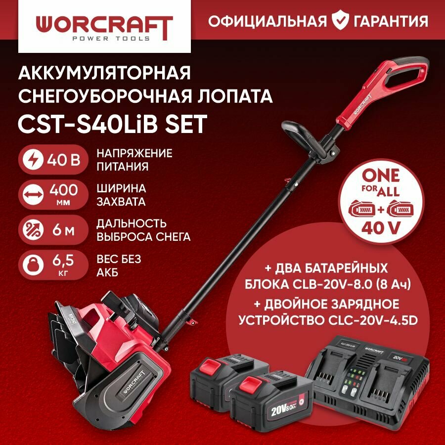 Купить Снегоуборочная машина WORCRAFT CST-S40LiB аккумуляторная, 40 В, бесщ. двиг, захват 40 см, выброс 6 м, 2 АКБ и ЗУ в комплекте. с доставкой по всей России. Снегоуборочная машина WORCRAFT CST-S40LiB аккумуляторная, 40 В, бесщ. двиг, захват 40 см, выброс 6 м, 2 АКБ и ЗУ в комплекте.: сравнение цен, характеристики, фото, актуальное наличие и цены.