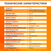 Подогрев ручек; топливо: бензин АИ-92; тип передачи: фрикционный диск; колеса: 14х4.10-6; объём масляного бака: 0,6 л