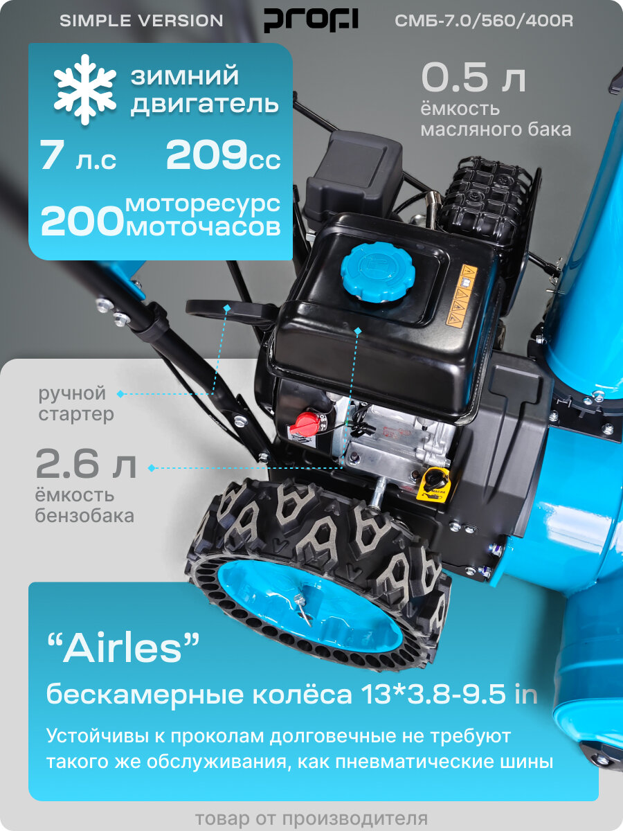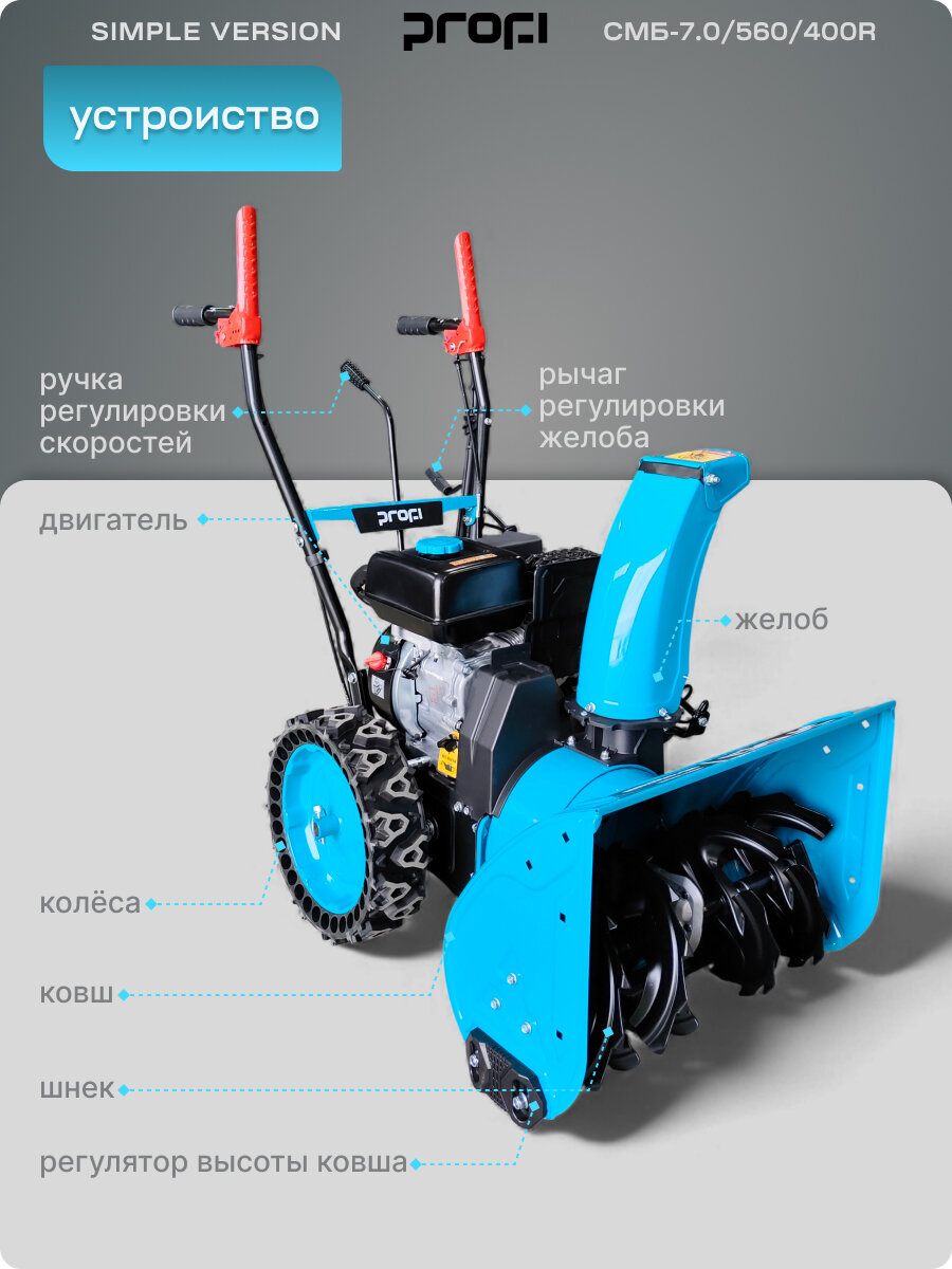 Снегоуборщик бензиновый машина снегоуборочная 7 л. с. ковш ширина 560 высота 400, безвоздушные колеса PROFI SIMPLE VERSION СМБ-7.0/560/400R: сравнение цен, характеристики, фото, актуальное наличие и цены.