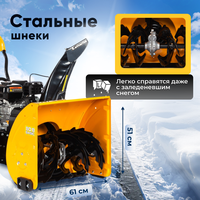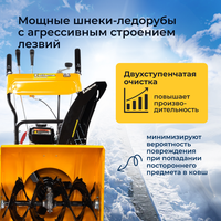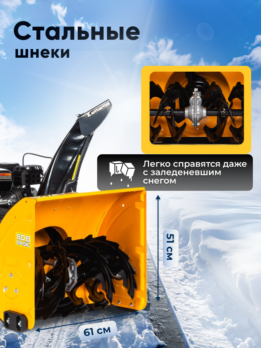 Kettama 80B — одна из самых популярных моделей в своём классе с управлением на панели оператора. 80B относится к линейке бытовых снегоуборщиков Basic, обладая всеми её достоинствами. При демократичной цене качество основных узлов остаётся на высоком уровне. Это касается рамы, редуктора, ДВС и трансмиссии. Снизить цену удалось благодаря оптимизации опций комфорта. То есть, эти модели максимально упростили, оставив только основные элементы, необходимые для качественной уборки снега. При этом всё управление вынесено на панель оператора. Эта модель способна справляться со снегом плотностью до 400 кг/м3 с производительностью до 4 т/ч. Этому способствует достаточно высокая мощность двигателя в 7 л. с. при небольшой ширине уборки в 610 мм. Kettama 80B Basic объединяет удобство управления и достаточно высокую рабочую ресурсность. Kettama 60B имеет возможность управления одной рукой. Это становится возможным благодаря одновременной фиксации рычагов движения колёс и шнека. Учитывая, что рычаг управления дефлектором выброса снега находится на панели оператора, уборка снега становится очень быстрой и удобной. Все конструктивные решения и качество материалов направлены на увеличение срока службы. Например, оси колес и шнека подвешены не на втулках, а на подшипниках. Большинство пластиковых элементов заменены на металлические. Дефлектор из усиленного металла даёт возможность менять направление выброса снега на 190 градусов при помощи рукоятки на корпусе машины, позволяя длительное время непрерывно заниматься уборкой практически всех типов снега. Стальной агрессивный шнек с добавлением хромомолибденового сплава позволяет эффективно справляться даже со слежавшимся снегом с элементами глетчерного льда. Скорость уборки: 6 передач вперед и 2 назад, что позволяет выбрать оптимальный режим работы в зависимости от сложности задачи и типа снега. Металлическая рама с добавлением холодостойкого нихрома обеспечивает долговечность конструкции и возможность работать даже при экстремально низких температурах Снегоуборщики Kettama. Наша техника станет для вас отличным подспорьем в уборке льда. Надёжный и стабильный двигатель с длительной гарантией, обеспечиваемой опытными специалистами, всегда вас выручит в момент нужды и избавит от лишней мороки. При этом нашим инженерам удалось добиться достойного соотношения качества к цене. Это позволит облегчить жизнь Вам и Вашей семье, не получив серьёзного урона по кошельку. Снегоуборщики Kettama являются одними из самых передовых и технологичных на российском рынке. Несмотря на свой привлекательный внешний вид, дизайн предельно прост и функционален, что повышает надёжность техники, исключая случайные поломки и снижая частоту обслуживания даже при регулярном использовании. Специально разработанные шнеки-ледорубы с агрессивным строением лезвий позволяет избавляться от любого, даже замёрзшего снега, и даже льда. Благодаря им Вы просто не будете знать, что есть непреодолимые препятствия. Специально разработанная система направляющих механизмов позволяют регулировать наклон и положение ковша, давая возможность адаптировать механизм под любые ситуации. Проверенные временем и сотнями тысяч пользователей из самых разных стран, пневматические колёса, были разработаны для самых жёстких условий. Увеличенные диаметр и ши