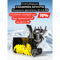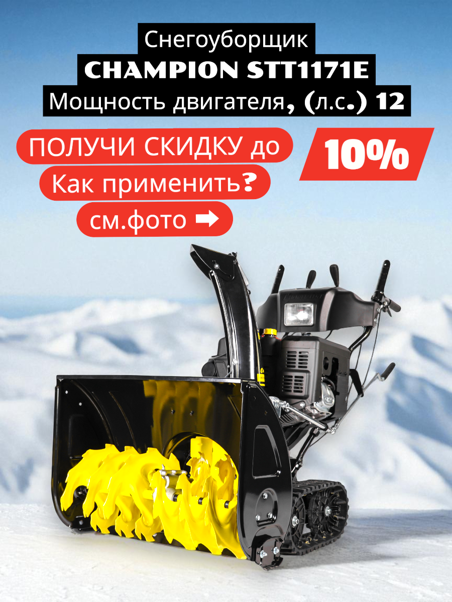 Купить Снегоуборщик CHAMPION STT1171E (12л. с,70см,6F/2R, гусеница,123,5кг, эл. старт, фара, обогрев, зимн. дв) с доставкой по всей России. Снегоуборщик CHAMPION STT1171E (12л. с,70см,6F/2R, гусеница,123,5кг, эл. старт, фара, обогрев, зимн. дв): сравнение цен, характеристики, фото, актуальное наличие и цены.
