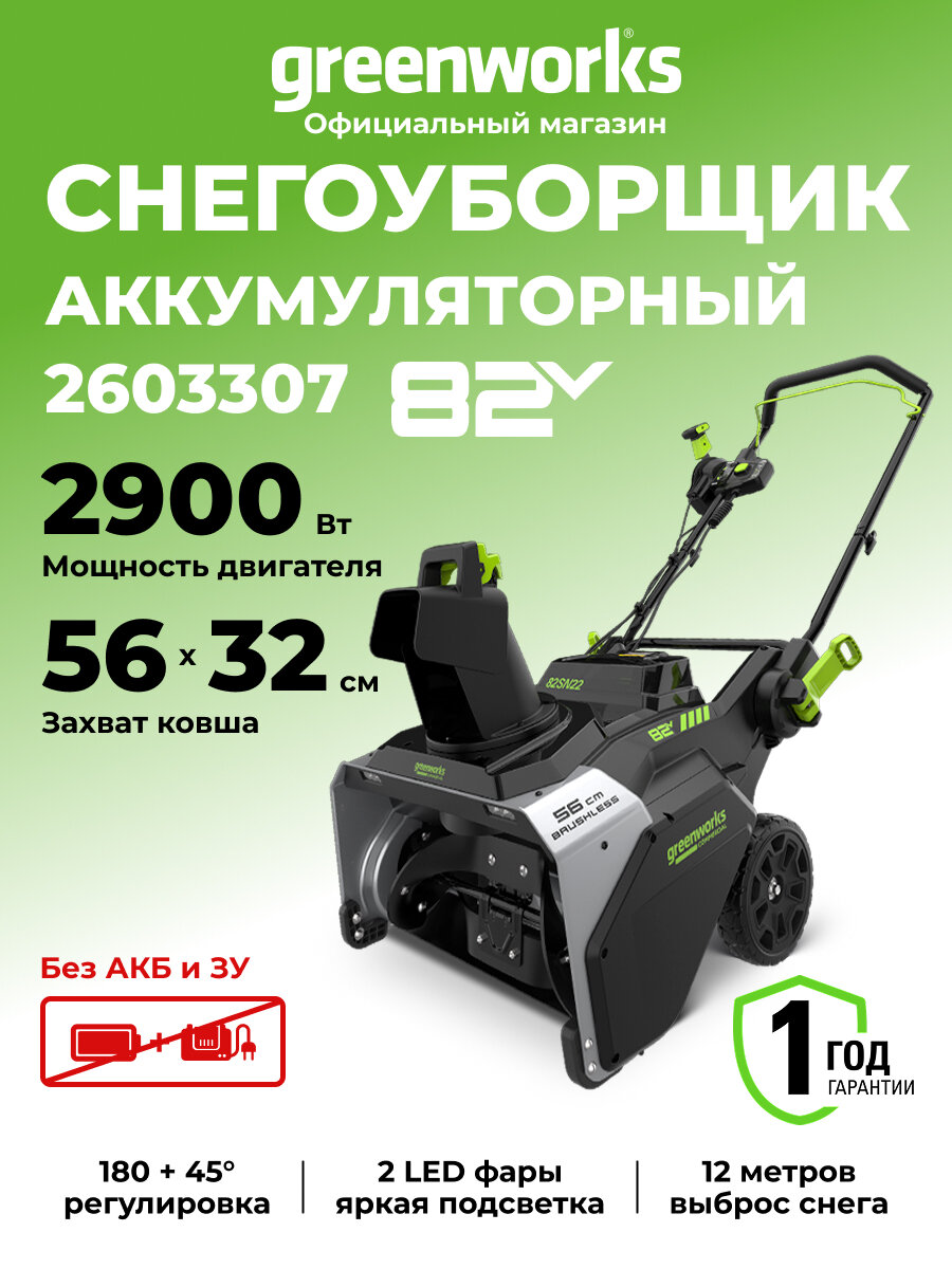 Снегоуборщик Greenworks 2602507UB 82В, бесщёточный двигатель, ширина захвата 56см: сравнение цен, характеристики, фото, актуальное наличие и цены.