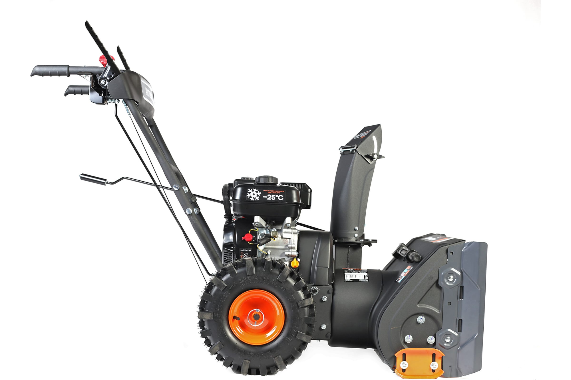 гарантированная работа двигателя при -25 °C; свеча зажигания F7RTC; охлаждение воздушное; стартер ручной; тип топлива бензин АИ-92; максимальная частота вращения шнека 3600 об/мин; тип колес - Пневматические Winter Extreme 2; уровень шума при работе 70 дБ; направление выброса снега 70°; емкость масляного картера 0.6 л