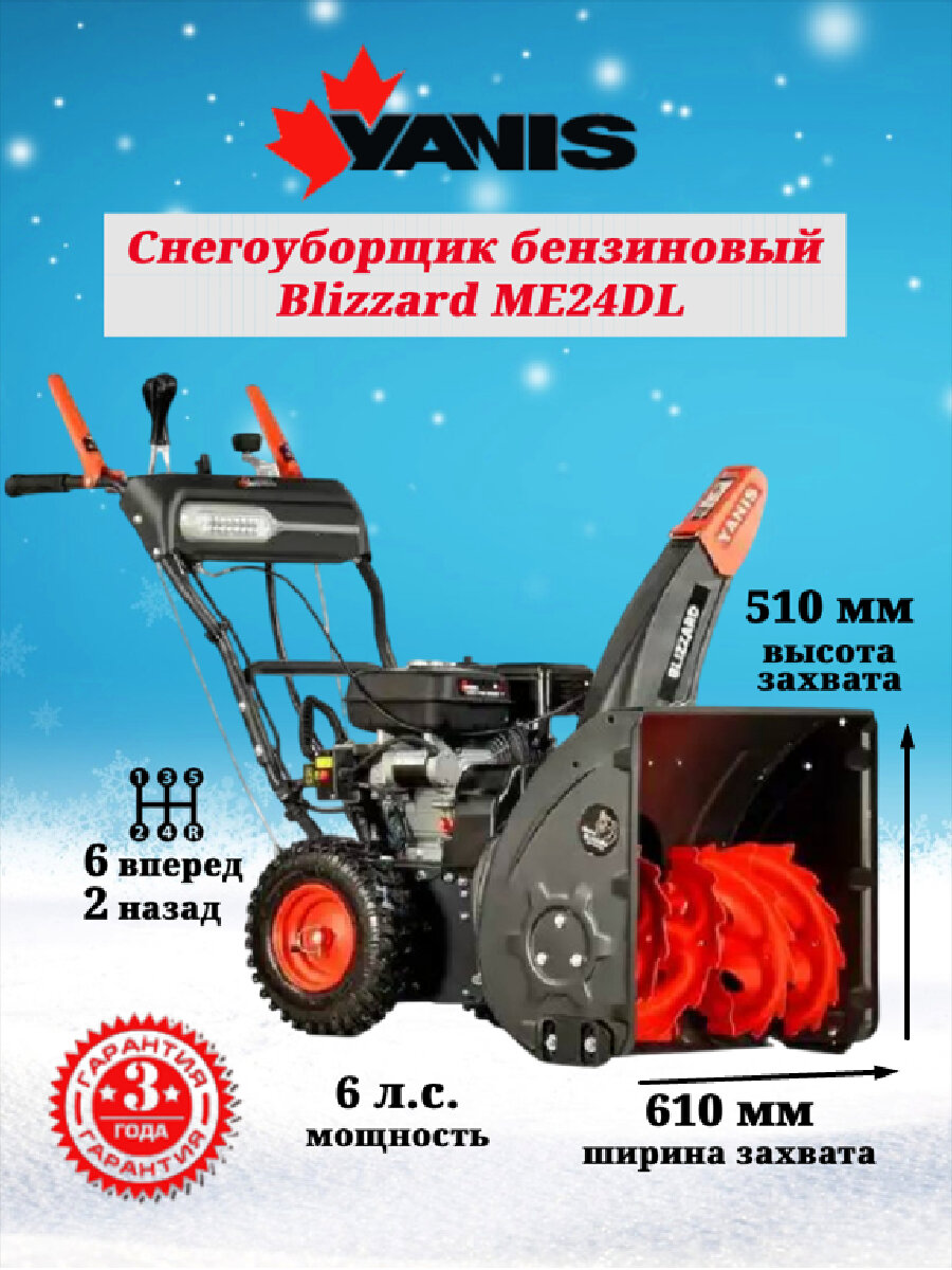 Снегоуборщик Yanis Blizzard ME24DL, самоходный, мощность 6 л. с, LED-фара, выброс снега 11 м, ширина ковша 610 мм