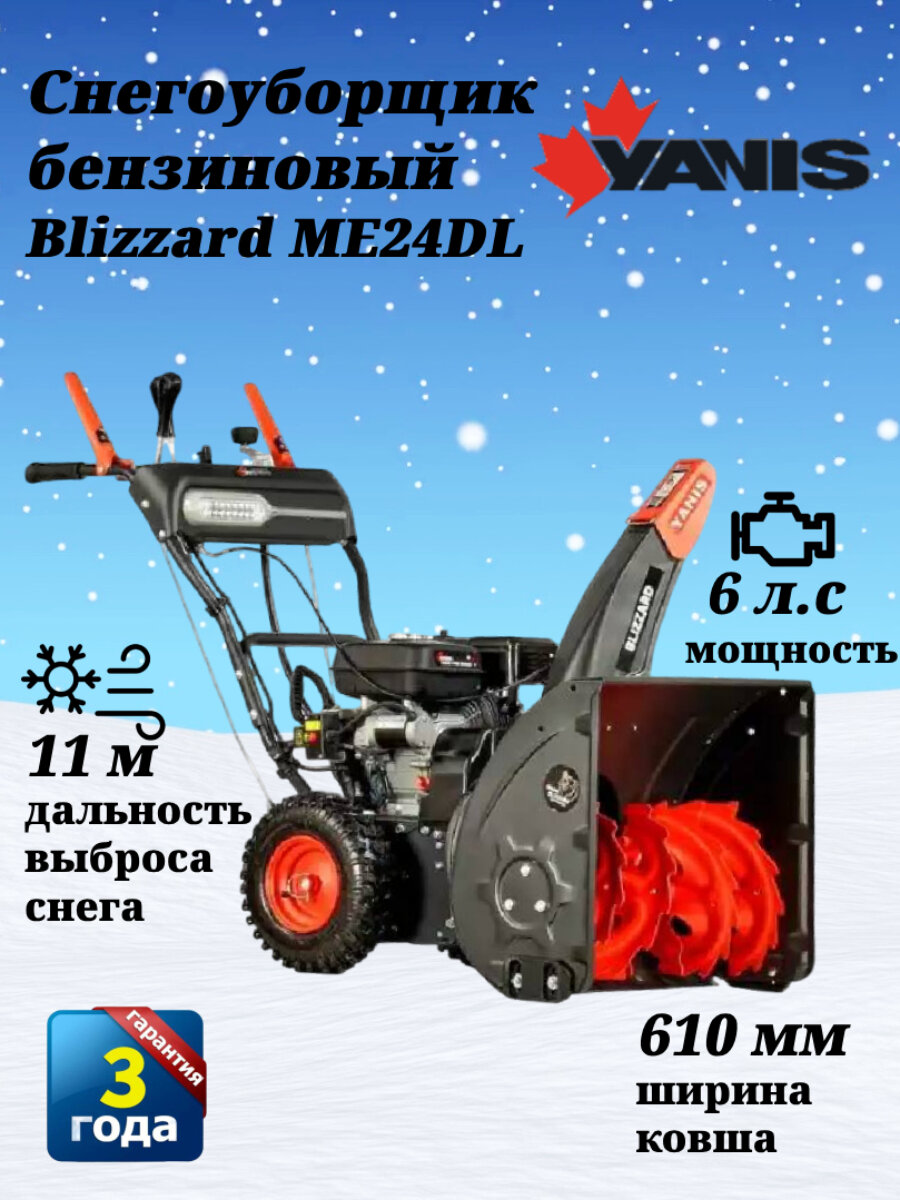Снегоуборщик Yanis Blizzard ME24DL, самоходный, мощность 6 л. с, LED-фара, выброс снега 11 м, ширина ковша 610 мм: сравнение цен, характеристики, фото, актуальное наличие и цены.