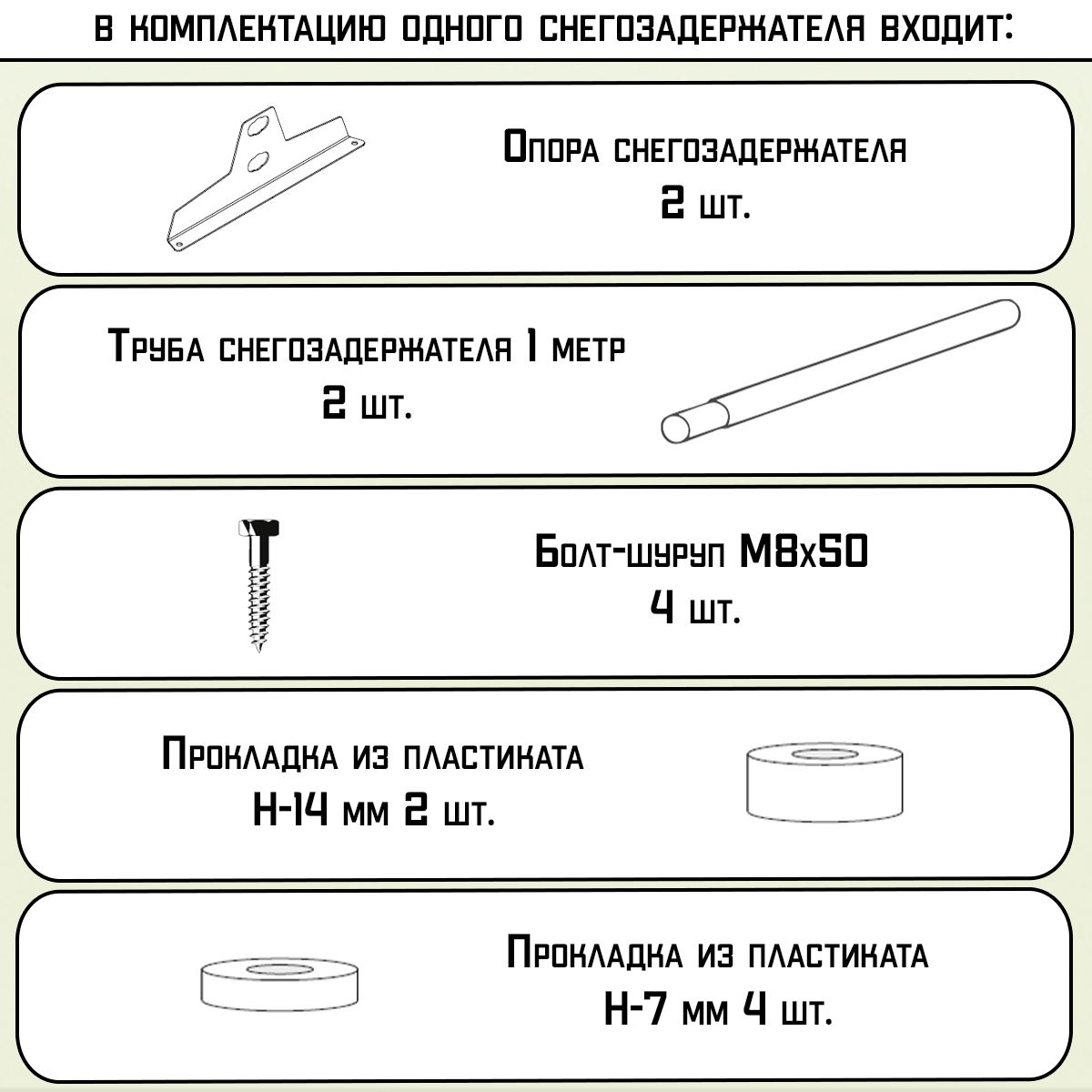 * труба круглая Ст3 D=25 мм - 2 шт. * Кронштейн Ст3 - 2 шт. * Глухарь М8х50 - 4 шт. (категорически не рекомендуем устанавливать кронштейны на кровельные саморезы) * EPDM прокладки, 2 мм - 4 шт. * EPDM прокладки, 14 мм - 2 шт. (применяется при монтаже на металлочерепицу) * Пластиковая заглушка, D=25 мм, - 2 шт.