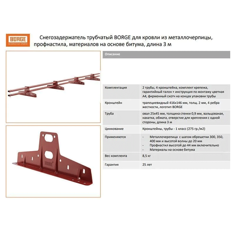 Снегозадержатель на крышу BORGE трубчатый 3м овальный (25х45мм 4 кронштейна) для металлочерепицы, профнастила и мягкой кровли коричневый (RAL 8017): сравнение цен, характеристики, фото, актуальное наличие и цены.