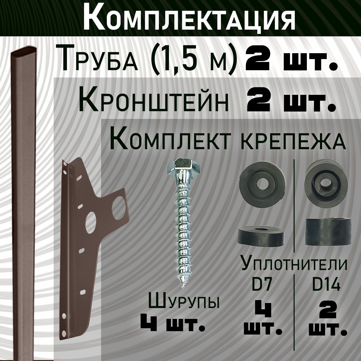 8 труб, 8 кронштейнов, комплект крепежа, инструкция по монтажу черно-белая