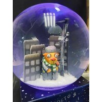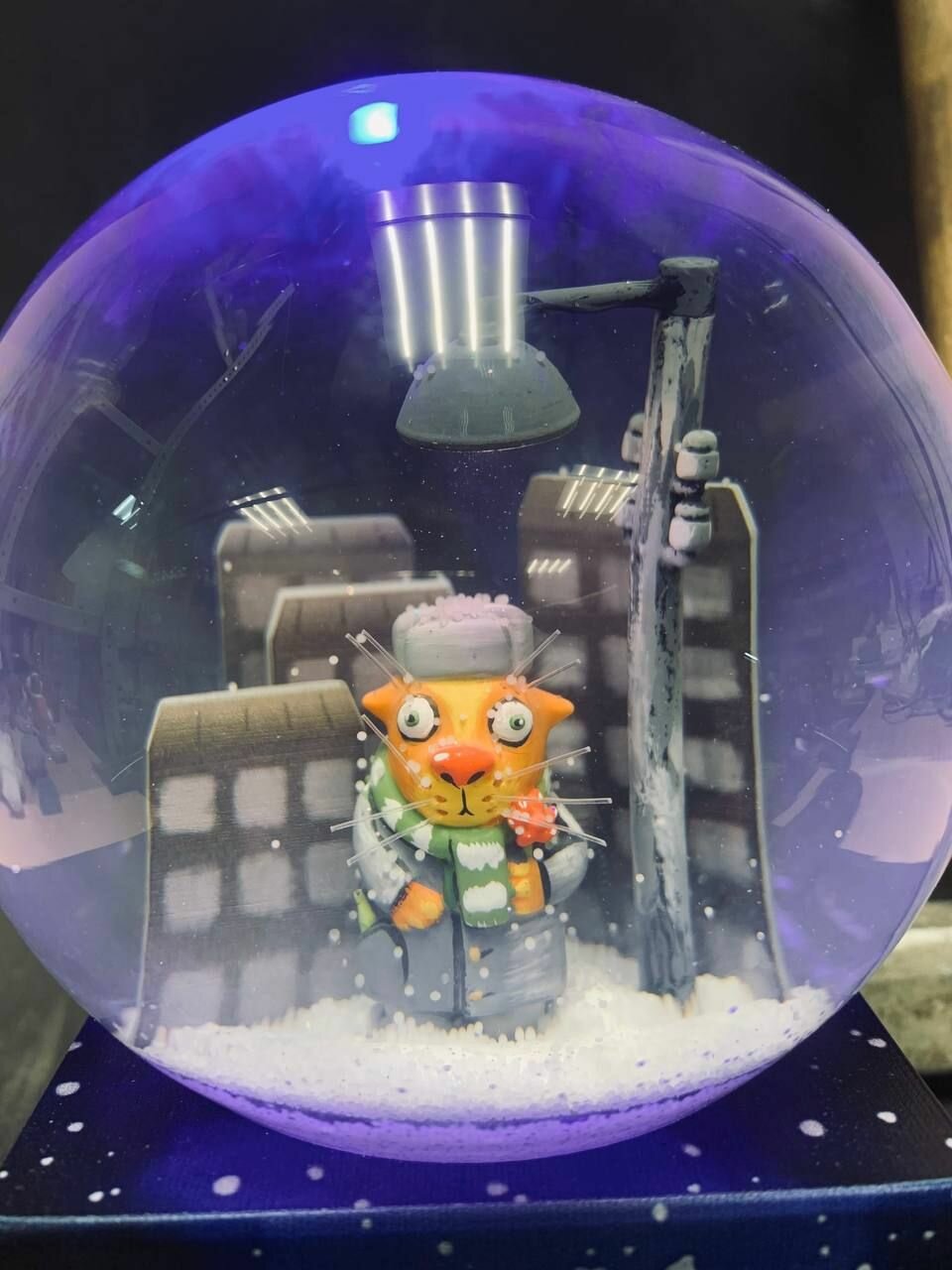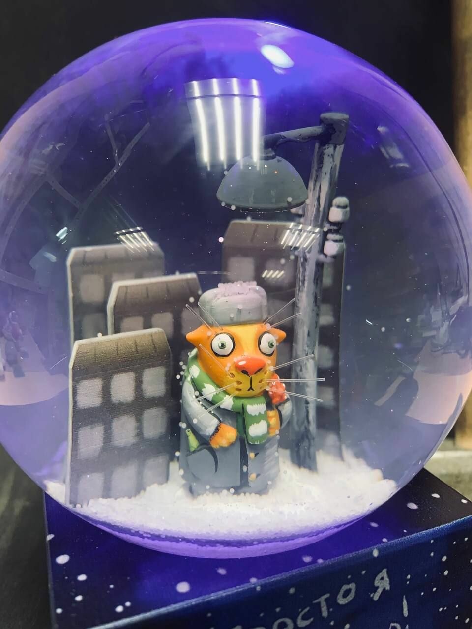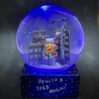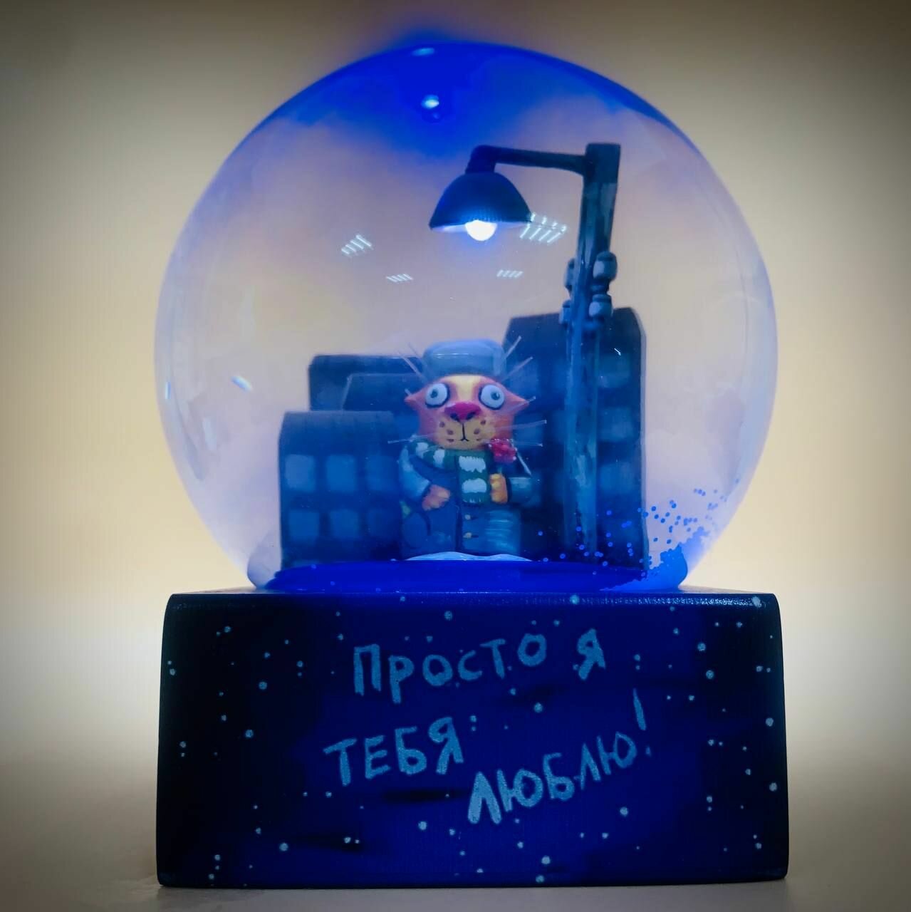Снежный шар по картине Васи Ложкина «Просто я тебя люблю». Если вы хотите сделать любимым подарок со вкусом и долей иронии - этот шарик вам подойдет. Сюжет, основанный на картинах российского художника, известного своей самобытностью, трогает грубоватой романтикой. Небритый котик в ушанке, с бутылкой горячительного в кармане и красным цветочком стоит в круге света от фонаря на фоне мрачных многоэтажек; что еще нужно для того чтобы выразить свои чувства? Шарик оснащен синей фоновой подсветкой, создающей эффект зимнего вечера, в нем горит уличный фонарь и летает легкий белый снег с небольшим количеством серебристых блесток. Работает от батареек, автометели нет.