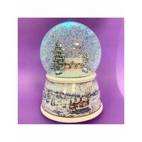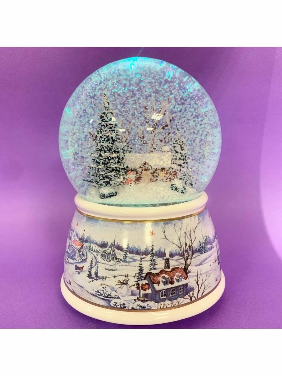 Снежный шар с домиком в лесу. Заснеженные елочки, клены и снегвичок с руками- веточками. Картину зимнего уединения согревает свет из окошек маленького домика притулившегося под мохнатой елью. Помимо светящихся окошек, в шарике есть внутренняя переливающаяся подсветка, автометель и мелодичная музыка. У выключателя три положения, что позволяет включить автометель со светом отдельно от музыки.