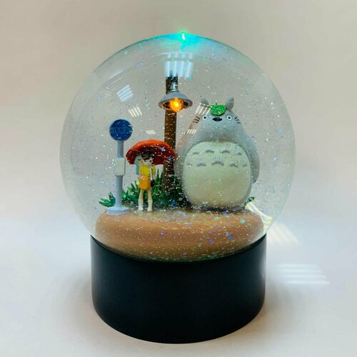 Небольшой и милый снежный шар по мотивам творчества Хаяо Миядзаки. Тоторо и его друзья стоят под дождем из блесток в теплом свете фонаря. Также шар оснащен переливающейся заполняющей фоновой подсветкой. Работает от батареек, диаметр 10 см.