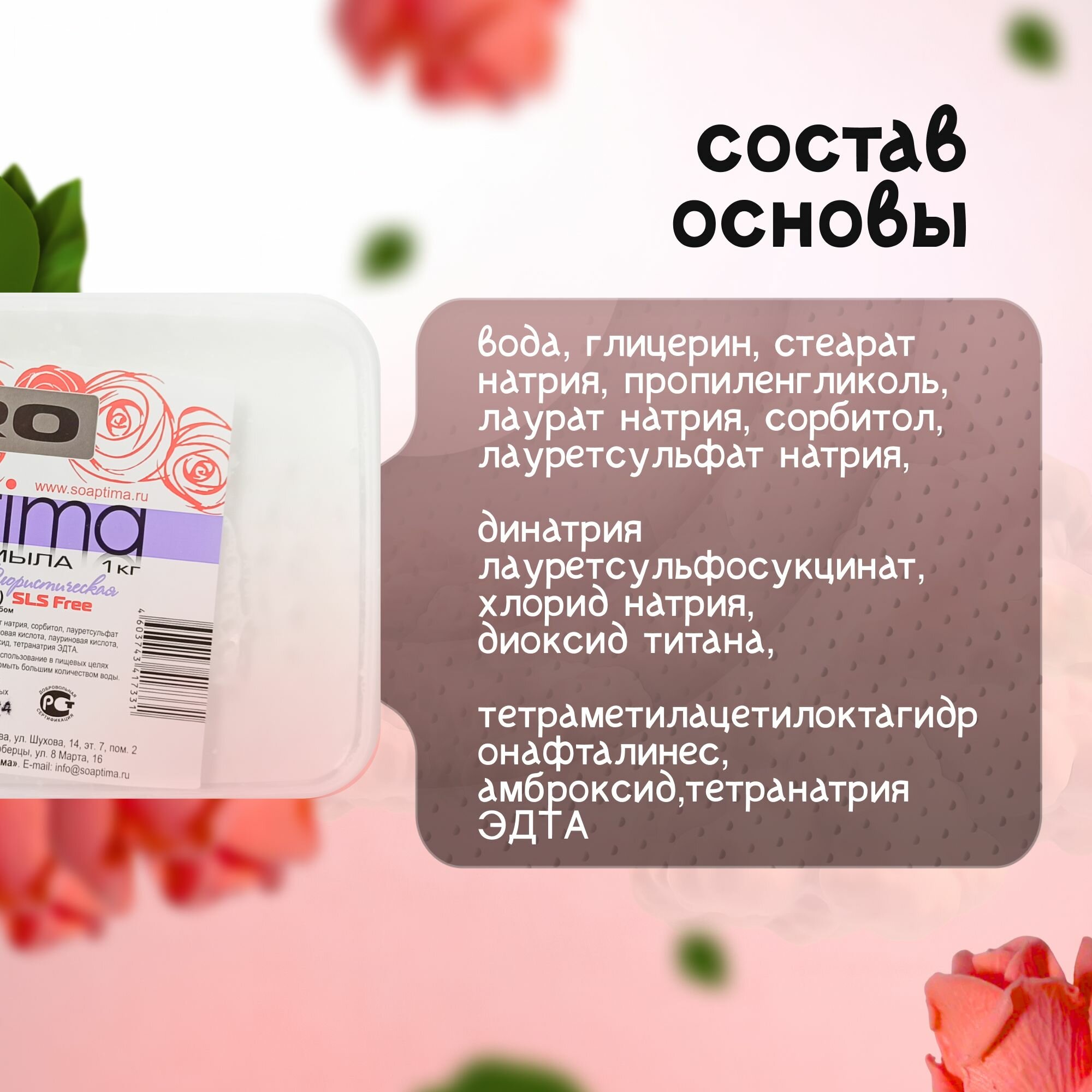 SOAPTIMA PRO ББО флористическая это основа, которая была создана по просьбам мыловаров и выбиралась на конкурсной основе из нескольких предложенных рецептур, а также тестировалась большой фокус-группой профессиональных мыловаров. PRO ББО флористическая адаптирована для флористов-мыловаров, при этом, она не является «узкоспециализированной» основой. Она может использоваться в любом направлении мыловарения, где используется мыльная основа.