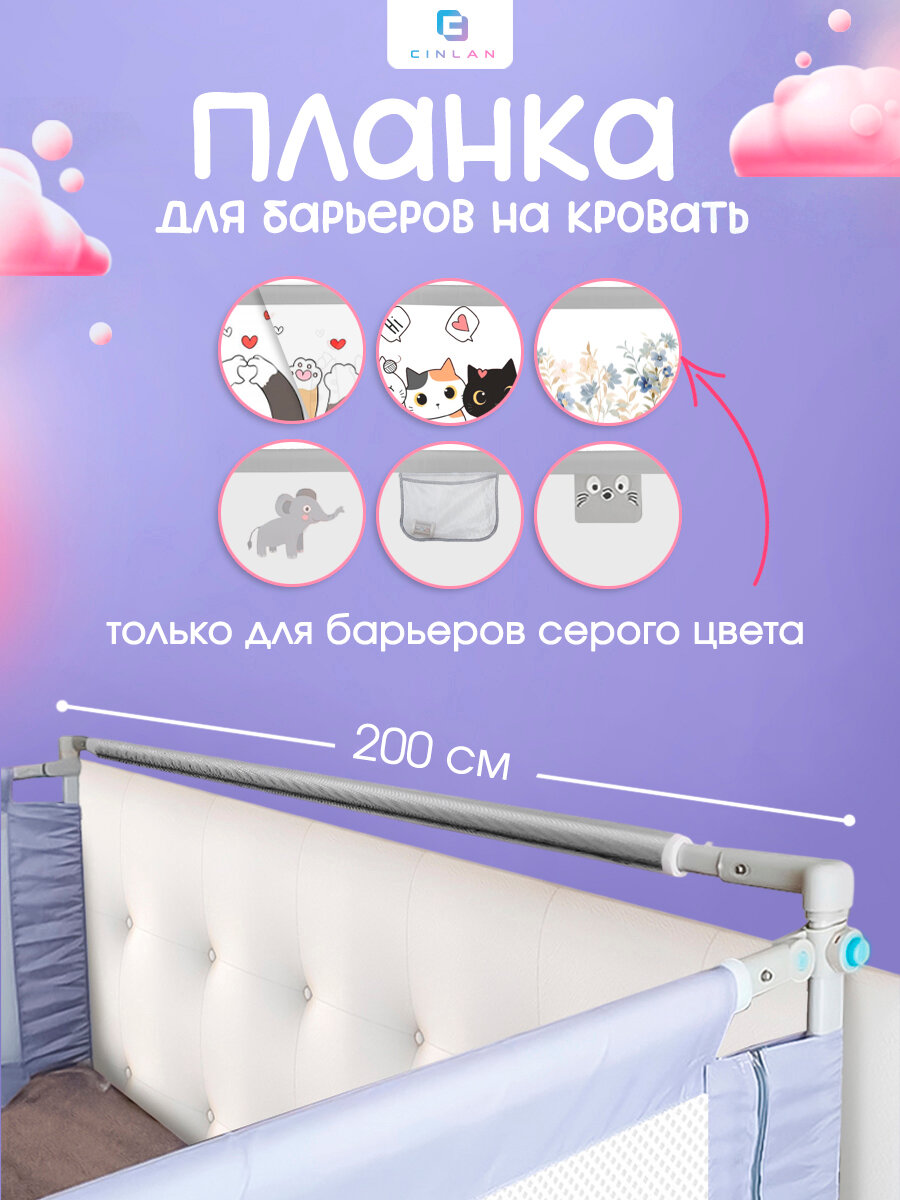 Соединительная планка в изголовье кровати способна усовершенствовать и улучшить использование защитных барьеров. Товар НЕ предусмотрен для моделей барьеров 100651667, 153738954, 153738955, 153738956, 86984964, 86984963, 86984965, 117623154, 86984962, 100648554, 100663229, 146335105, 100662908, 117623155 вне зависимости от их размера. Данная модель обновлена, поролон закрыт тканевым чехлом. Подходит только к серым барьерам без рисунка, барьеру с цветами, со зверем с ушками, а также со слоном. Среди плюсов отмечается повышенная защита от раскачивания - надежность соединения - устойчивость барьеров. Размер 200 см.