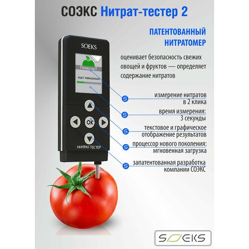 Нитрат-тестер Соэкс предназначен для экспресс-анализа содержания нитратов в свежих овощах и фруктах и свежем мясе. В памяти нитрат-тестера находятся данные о норме содержания нитритов в более чем 30 продуктах питания.