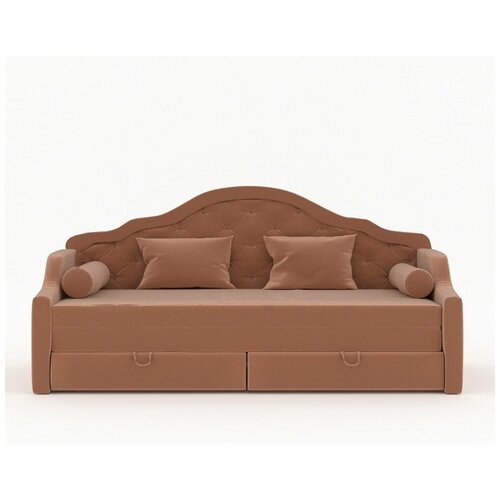 Софа «Версаль» – это прямой диван с выкатной системой трансформации, созданный в элегантном классическом дизайне. Изголовье (спинка) с мягкой каретной стяжкой придаст уют спальне с любым интерьером и будет там главным украшением. Модель дополняется двумя мягкими подушками и стильными валиками, которые входят в стоимость изделия Габаритные размеры: Ш: 212см Г: 103см, В: 112см Спальное место: Д: 190см, Ш: 190см Наполнитель: ППУ Механизм: выкатной 2 бельевых ящика: полноразмерный Каркас: брус, фанера, плитные материалы Ткань: велюр Описание: Компактная софа классического дизайна. Легко трансформируется в удобное, ровное спальное место. Каркас изготовлен из плитных материалов, фанеры и хвойных пород древесины. Мягкие элементы выполнены из пенополиуретана , сертифицированного по стандарту CertiPUR. Ящик изготовлен с ипользованием ЛДСП.