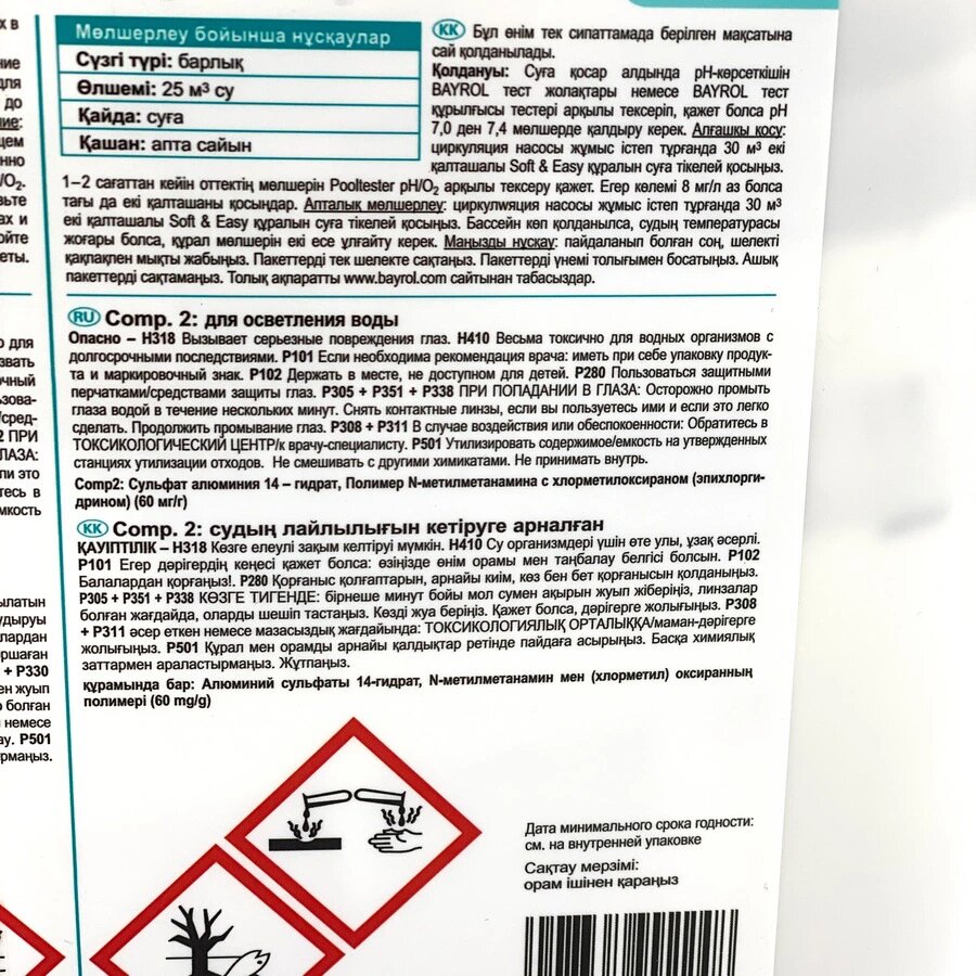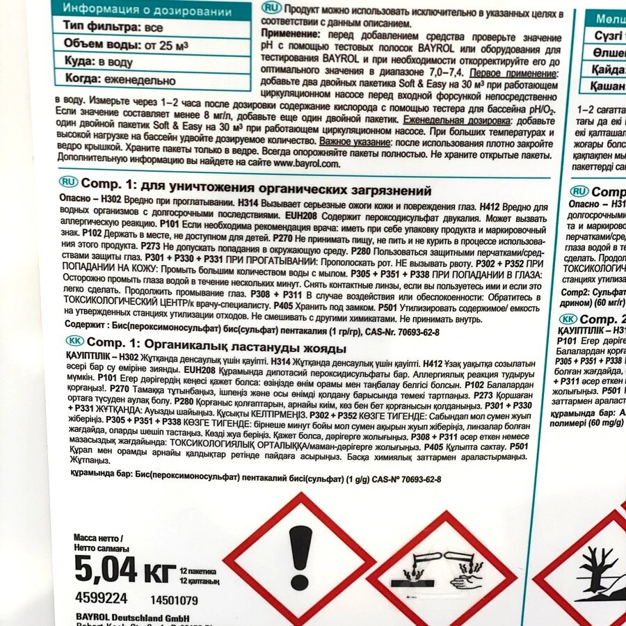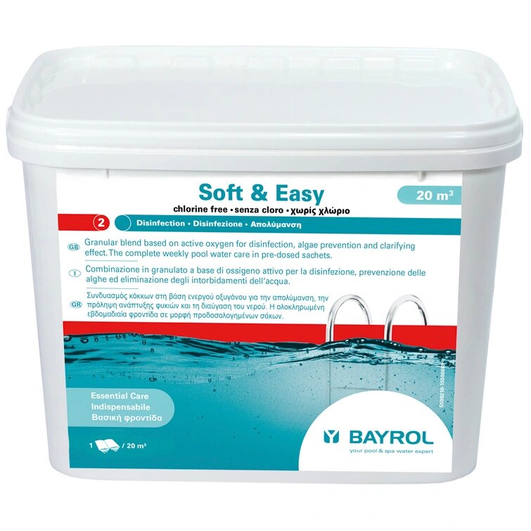 Soft & Easy – комплекс для очищения воды, основанный на активном кислороде в сконцентрированной форме в гранулах. Содержит вещества для надежной дезинфекции, предотвращения роста водорослей и имеет осветляющий эффект. Soft & Easy рН нейтрален и содержит вещества для буферизации рН. Активные вещества: смесь моноперсульфата калия (большой пакет), полигидрооксипропилен-диметиламония хлорид (маленький пакетик), осветлитель.