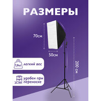 Сборка и настройка софтбокса очень быстрая и простая, что делает его удобным и доступным для использования как опытными профессионалами, так и начинающими. В комплекте идут все необходимые компоненты: сам софтбокс, стабильный штатив, 1 лампа мощностью 150 Вт, пульт управления, патрон, провод питания и рассеиватель.