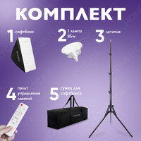 Сборка и настройка софтбокса очень быстрая и простая, что делает его удобным и доступным для использования как опытными профессионалами, так и начинающими. В комплекте идут все необходимые компоненты: сам софтбокс, стабильный штатив, 1 лампа мощностью 85 Вт, пульт управления, патрон, провод питания и рассеиватель.