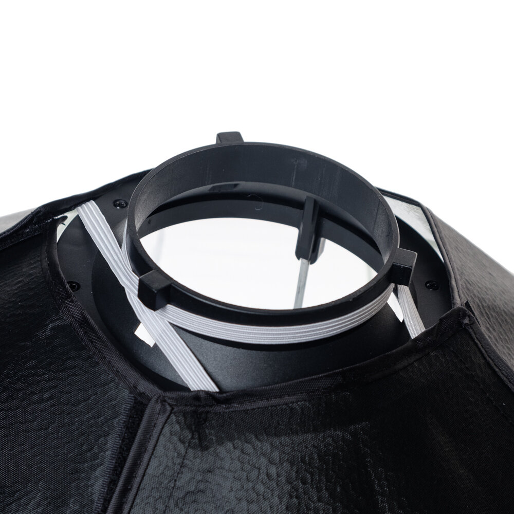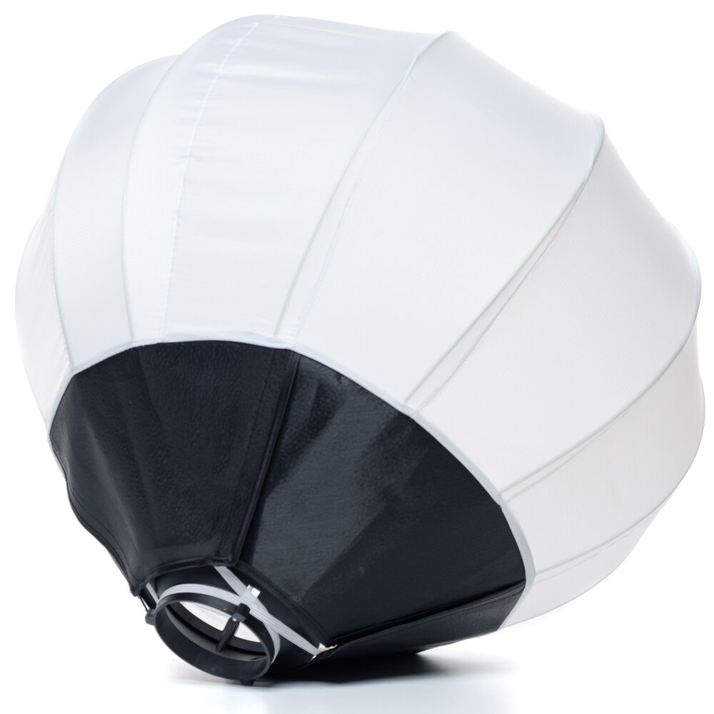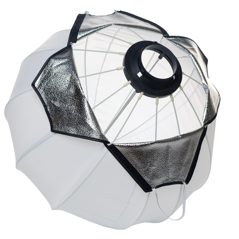 Каркас сферы представляет собой два кольца, с зафиксированными 12 гибкими спицами. Кольцо-адаптер для байонета Bowens закреплено на большом кольце каркаса. Кольца каркаса и байонет - пластиковые, спицы - карбоновые. Прочный тканевый тент надевается на каркас. Белая рассеивающая ткань тента имеет высокую пропускную способность, практически не изменяет цветовую температуру и незначительно уменьшает мощность выходного светового потока.
