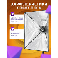С помощью софта Вы сможете легко улучшить картинку на фото или видео. Софтбокс состоит из: светоотражающего софтбокса 50х70см; держателя для лампы с цоколем E27 и выключателем лампы на проводе; чехол. Имеет мягкий рассеиватель. Благодаря прямоугольной форме и конструкции каркаса в виде зонта, софтбокс имитирует естественное освещение. Синтетическая ткань на софтбоксе в качестве светоотражающей поверхности с высоким коэффициентом отражения. Подходит для создания источника постоянного света для видео!