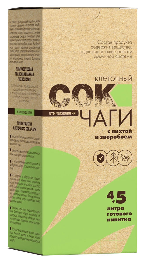 Уникальная UTM-технология позволяет сохранить жизненно важные вещества, содержащиеся в клетке, в первозданном виде. • Компоненты клеточного сока содержатся в максимально биодоступной для организма форме. • 4,5 литров готового напитка можно приготовить из одной упаковки, которой достаточно на месяц применения. • Чага, собранная в сибирской тайге, содержит уникальный спектр жизненно важных соединений в высоких концентрациях. Ее богатейший состав обусловлен суровыми условиями выживания и чистотой таежного воздуха. В условиях жесткого климата растениям свойственно накапливать большое количество защитных факторов, которые могут положительно влиять на здоровье человека. • В исходном сырье строго контролируется содержание биологически активных компонентов, что подтверждает аккредитованная лаборатория компании, применяющая современные методы исследований и оборудование. • Отсутствие вредных веществ, таких как радионуклиды, токсичные вещества и тяжелые металлы, подтверждает удостоверение качества безопасности продукта.