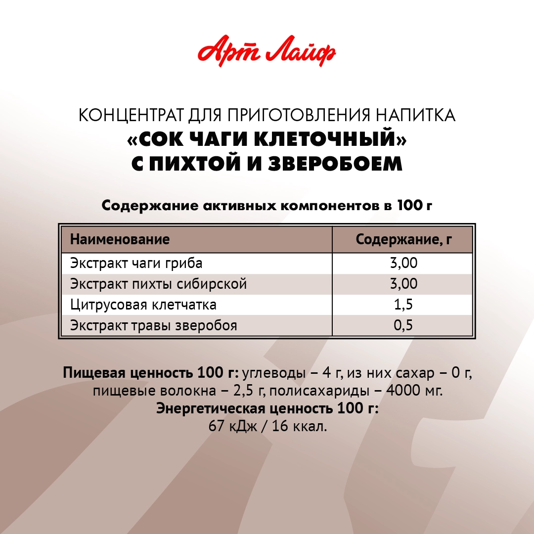 Купить Сок Чаги клеточный с пихтой и зверобоем 450 мл, Поддерживает работу иммунной системы. Арт Лайф с доставкой по всей России. Сок Чаги клеточный с пихтой и зверобоем 450 мл, Поддерживает работу иммунной системы. Арт Лайф: сравнение цен, характеристики, фото, актуальное наличие и цены.