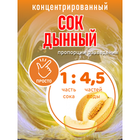 Состав концентрат дынного сока 100% Описание Натуральный концентрированный Дынный сок. В составе только дыня. В составе НЕТ никаких добавок Е, красителей, консервантов, ароматизаторов, сахара и сахаросодержащих продуктов, лимонной или другой кислоты . Вы можете легко приготовить 5,5л натурального сока из 1 кг концентрата просто добавив воды в соотношении 1кг концентрата на 4,5л воды. Может быть использован как основа для получения алкогольных напитков, прекрасно сбраживается. Содержание сухих веществ не менее 70%. При производстве сока не используются генетически модифицированные продукты. Сделано в России.