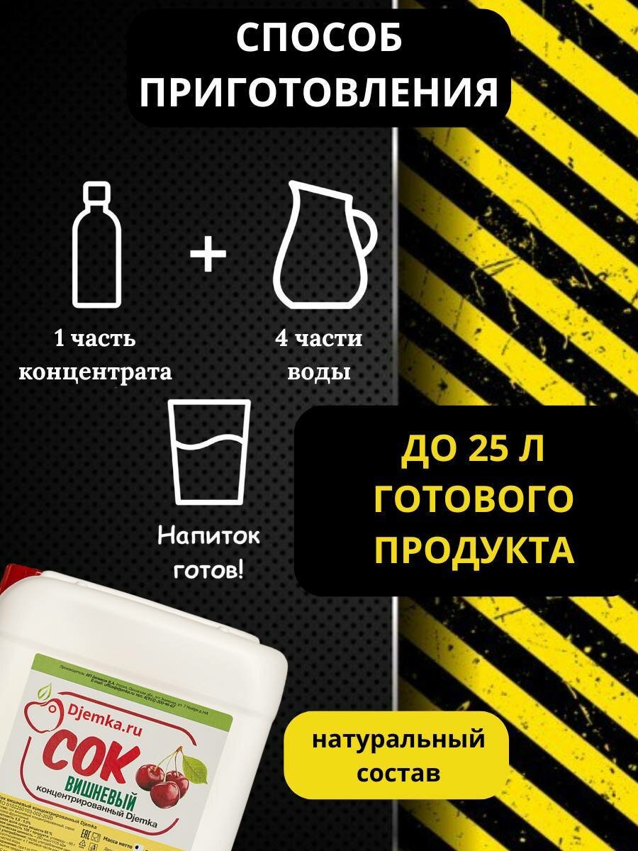 Для приготовления вишневого сока: разведите концентрат сока с питьевой водой в весовом соотношении 1 к 5 (на 1 кг концентрата 5 литров воды), далее разбавляйте сок по вкусу.