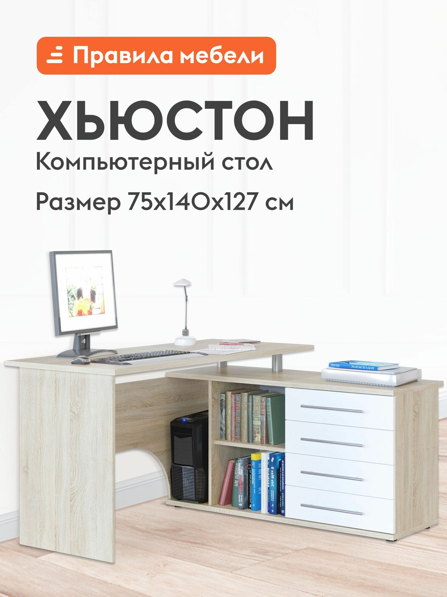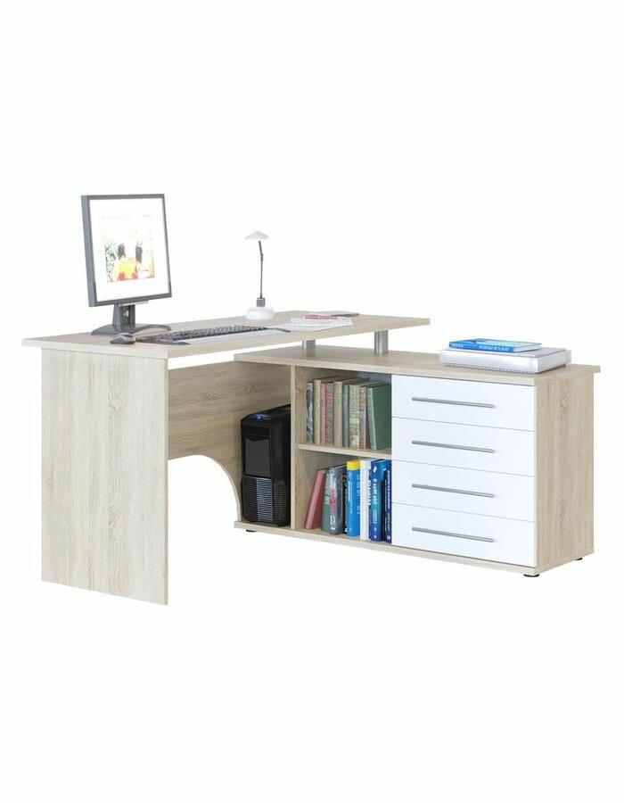 Компьютерный, письменный угловой, стол Хьюстон с ящиками, с полками, с тумбой, 140х127х75 см, Дуб Сонома / Белый, Правый: сравнение цен, характеристики, фото, актуальное наличие и цены.