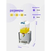 Сокоохладитель EKSI JDB-1x10L предназначен для охлаждения и подачи напитков в кафе, барах, ресторанах, а также на мероприятиях и в общественных заведениях, где требуется быстрое и эффективное обслуживание клиентов. Данная модель обладает одной емкостью на 10 литров. Охлаждение напитков обеспечивается надежной и эффективной системой охлаждения, поддерживающей идеальную температуру для сохранения свежести и вкуса напитков. Прозрачная емкость позволяет легко контролировать уровень напитков и быстро реагировать на необходимость пополнения. Удобство использования, простота в обслуживании и устойчивый корпус делают EKSI JDB-1x10L незаменимым устройством для любого заведения, стремящегося обеспечить высокое качество обслуживания и удовлетворенность клиентов.