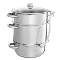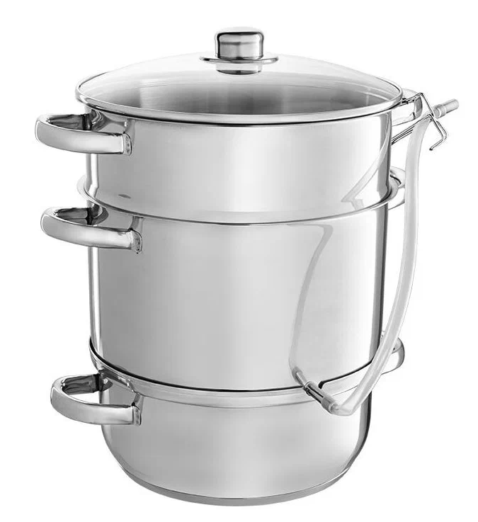 материал крышки: стекло; материал ручек: сталь; соковарка состоит из 3 ярусов (емкость для воды диаметр 20 высота 10.5 см, емкость для фруктов диаметр 22 высота 11 см, емкость для сока диаметр 22 высота 11.5 см)