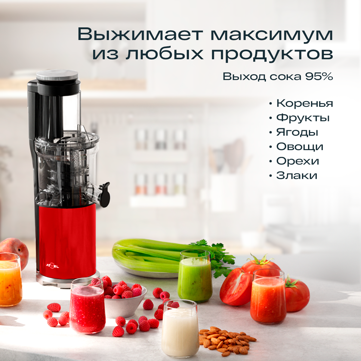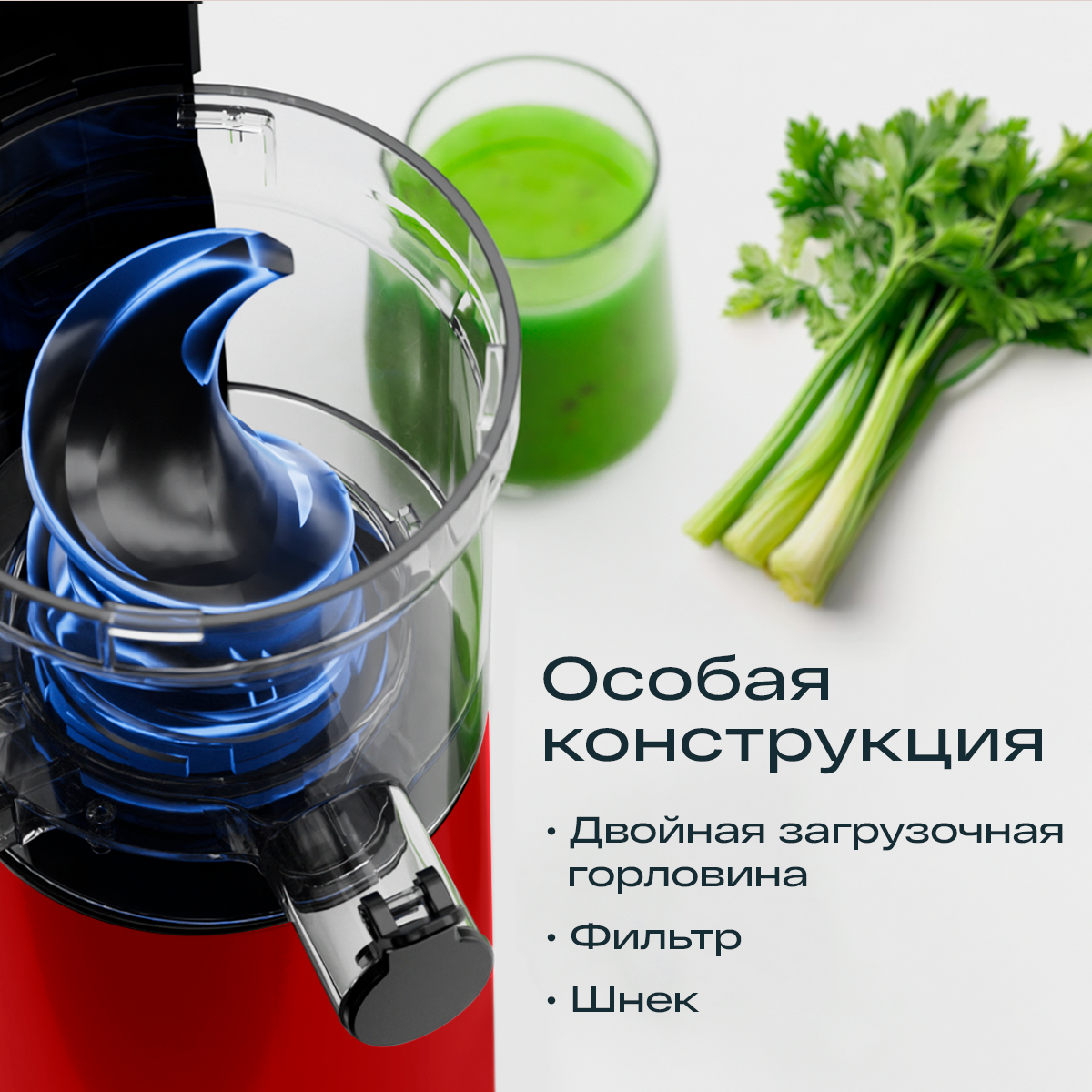 Особая конструкция шнека. Усовершенствованный фильтр эффективно отделяет волокна, очищая сок от мякоти на 88. Оптимальная скорость работы шнека обеспечивает идеальные условия для отжима с сохранением всех витаминов, минералов и выхода 95 свежего сока.