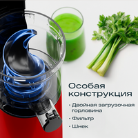 Двойная загрузочная горловина дает возможность использовать соковыжималку без преград для быстрой обработки плоды можно загружать целиком.