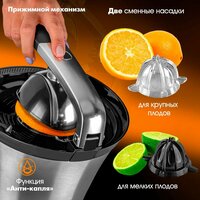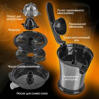 | Дополнительная информация | Две съемные насадки для крупных и мелких цитрусовых плодов, Двойной регулирующий фильтр. |