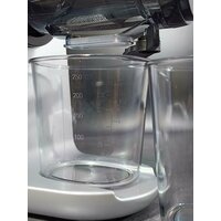 соковыжималка, резервуар для мякоти объемом 360 мл, резервуар для сока объемом 250 мл, фильтр из нержавеющей стали, шнек-пресс, загрузочный лоток, толкатель и инструкция по эксплуатации на русском языке.