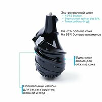 1. Бережный отжим. Соковыжималка готовит сок на низких оборотах (38 об/мин), поэтому продукты не перегреваются и не окисляются. На выходе получается полезный сок с большим количеством витаминов.