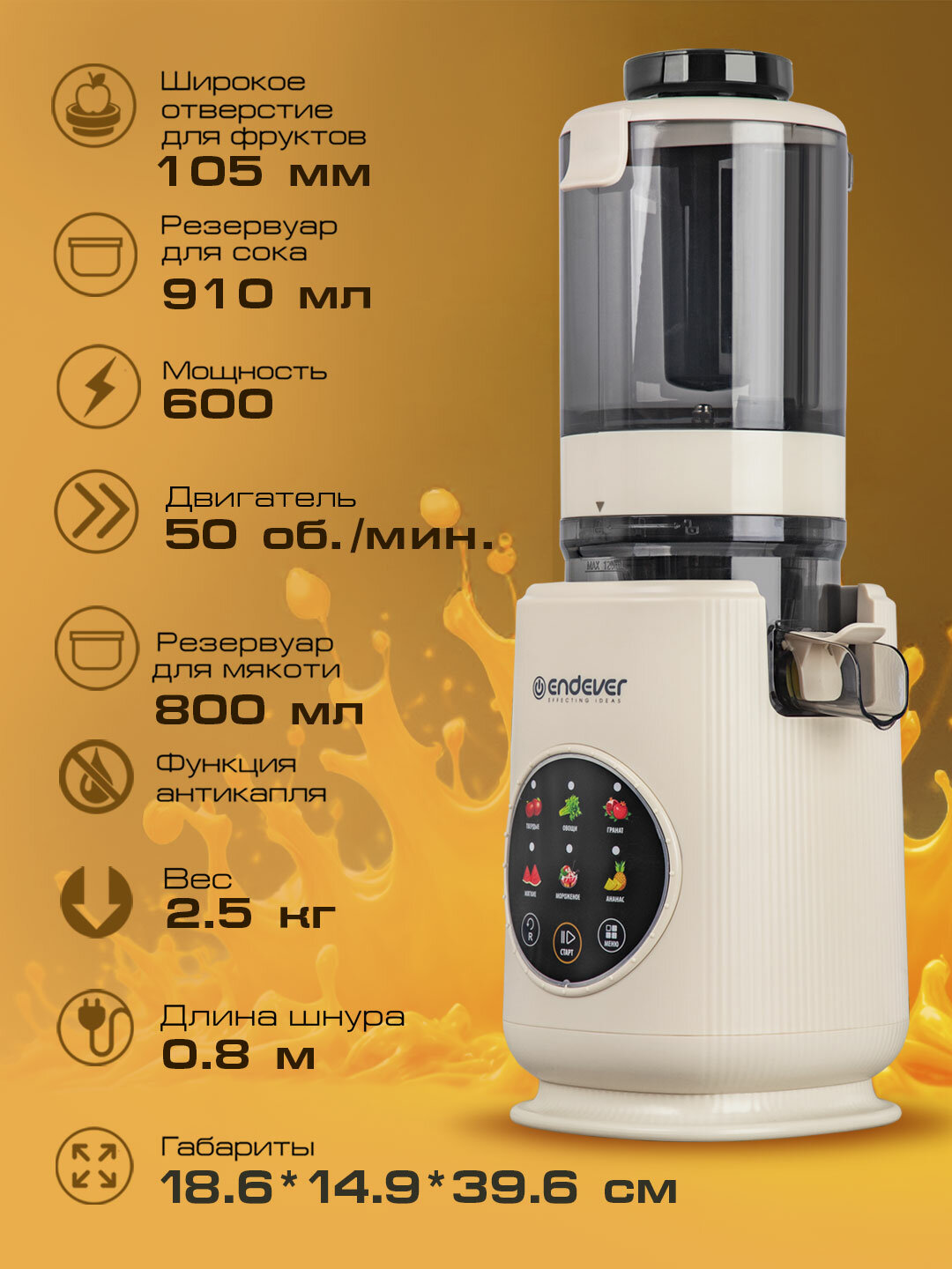 Соковыжималка шнековая ENDEVER SIGMA-160, вертикальная, 6 скоростей, прозрачная ёмкость: сравнение цен, характеристики, фото, актуальное наличие и цены.