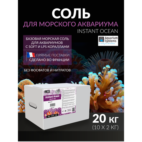 Соль для аквариума Instant Ocean. Упаковка 20 кг (2кг х 10 шт.) Преимущества: кристально чистая вода, правильная концентрация, быстрорастворимая, производится во Франции, отсутствуют примеси и загрязнения, засекреченная рецептура, основные показатели при солености 1.024: Ca – 400 мг/л, Mg – 1250 мг/л, 8 dKH. Соль для аквариума разработана специально для использования в морских системах. Каждый пакет и ведро анализируется, что гарантирует одинаковый состав. Соль для аквариума Instant Ocean является самой быстрорастворимой солью в мире. Это подтверждают отзывы по всему миру, а так же лабораторные исследования. Морская соль для аквариума Instant Ocean отлично подойдет для аквариумов с рыбой, SPS и LPS кораллами, а также она идеально подходит для выращивания креветок, омаров, крабов, моллюском и всех организмов, которым требуется морская вода со стабильными параметрами. Продукт Instant Ocean является первой коммерческой солью в мире и является самым продаваемым продуктом в мире. Завод находится во Франции в городе Сарбур и является самым большим и современным в Европе. Соль для аквариума Instant Ocean поставляется в 55 стран мира. Наша компания является эксклюзивным дистрибьютором ASF в России.