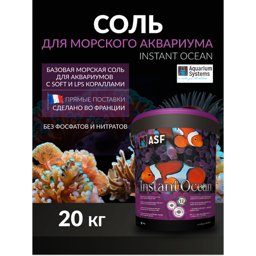 Соль для аквариума Instant Ocean. Преимущества: кристально чистая вода, правильная концентрация, быстрорастворимая, производится во Франции, отсутствуют примеси и загрязнения, засекреченная рецептура, основные показатели при солености 1.024: Ca – 400 мг/л, Mg – 1250 мг/л, 8 dKH. Соль для аквариума разработана специально для использования в морских системах. Каждый пакет и ведро анализируется, что гарантирует одинаковый состав. Соль для аквариума Instant Ocean является самой быстрорастворимой солью в мире. Это подтверждают отзывы по всему миру, а так же лабораторные исследования. Морская соль для аквариума Instant Ocean отлично подойдет для аквариумов с рыбой, SPS и LPS кораллами, а также она идеально подходит для выращивания креветок, омаров, крабов, моллюском и всех организмов, которым требуется морская вода со стабильными параметрами. Продукт Instant Ocean является первой коммерческой солью в мире и является самым продаваемым продуктом в мире. Завод находится во Франции в городе Сарбур и является самым большим и современным в Европе. Соль для аквариума Instant Ocean поставляется в 55 стран мира. Наша компания является эксклюзивным дистрибьютором ASF в России.