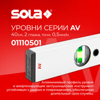 Купить SOLA Уровень AV 40, L = 40 см, 2 глазка, точн. 0,5мм/м 01110501 с доставкой по всей России. SOLA Уровень AV 40, L = 40 см, 2 глазка, точн. 0,5мм/м 01110501: сравнение цен, характеристики, фото, актуальное наличие и цены.