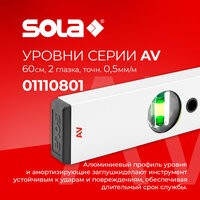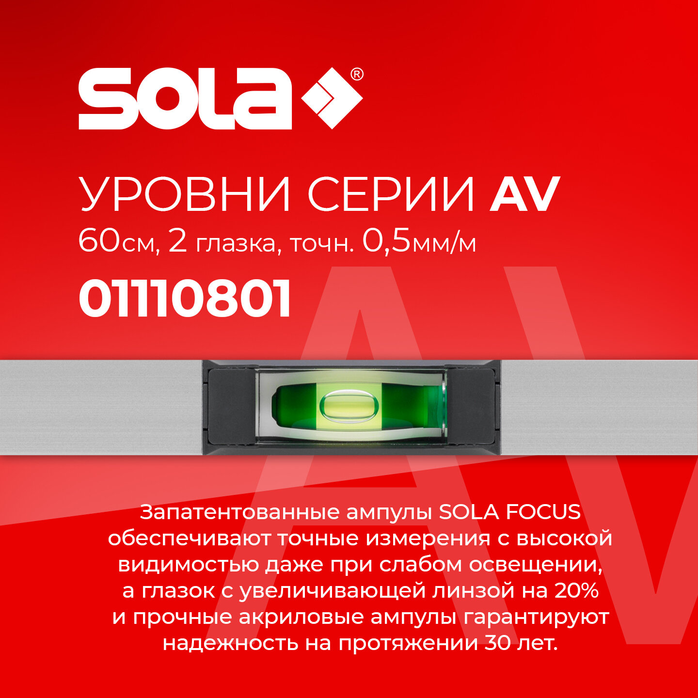 Купить SOLA Уровень AV 60, L = 60 см, 2 глазка, точн. 0,5мм/м 01110801 с доставкой по всей России. SOLA Уровень AV 60, L = 60 см, 2 глазка, точн. 0,5мм/м 01110801: сравнение цен, характеристики, фото, актуальное наличие и цены.