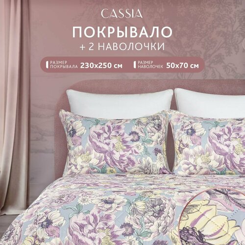 Это изысканное покрывало и наволочки украшены эффектным флоральным принтом. Крупные цветы сиреневых оттенков красиво выделяются на фоне светлой аквамариновой ткани. Выразительный рисунок подчеркивает мягкость 100% микрофибры. Покрывало легко расстилается, не тускнеет и сохраняет первоначальный вид даже после многократной чистки.