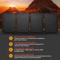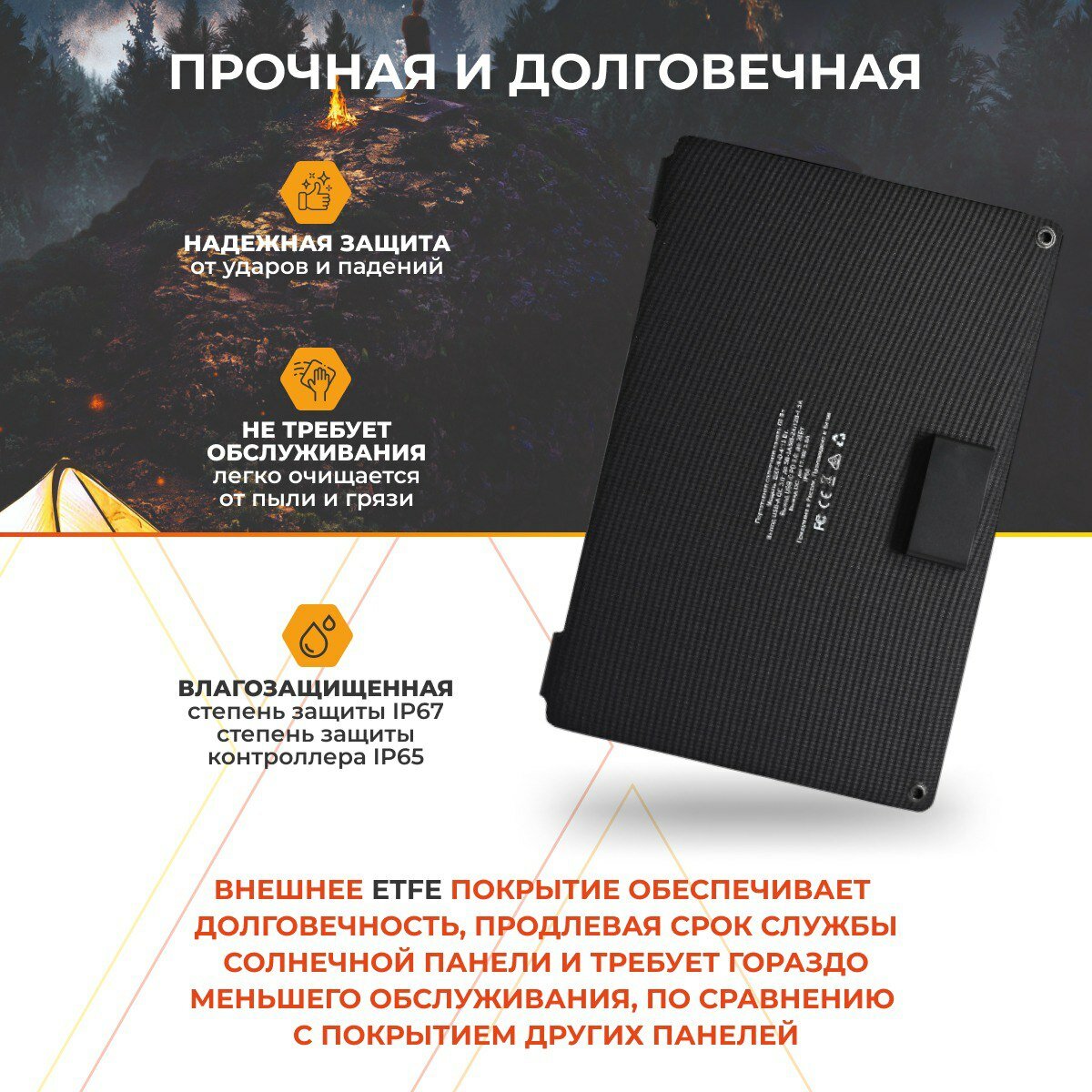 Идеально подойдет для активного отдыха на природе, лодке или в лесу. Благодаря ламинации этфе пленкой и 3мм слою ЭВА панель является антивандальной и ее можно легко переносить в рюкзаке вместе с другими вещами.