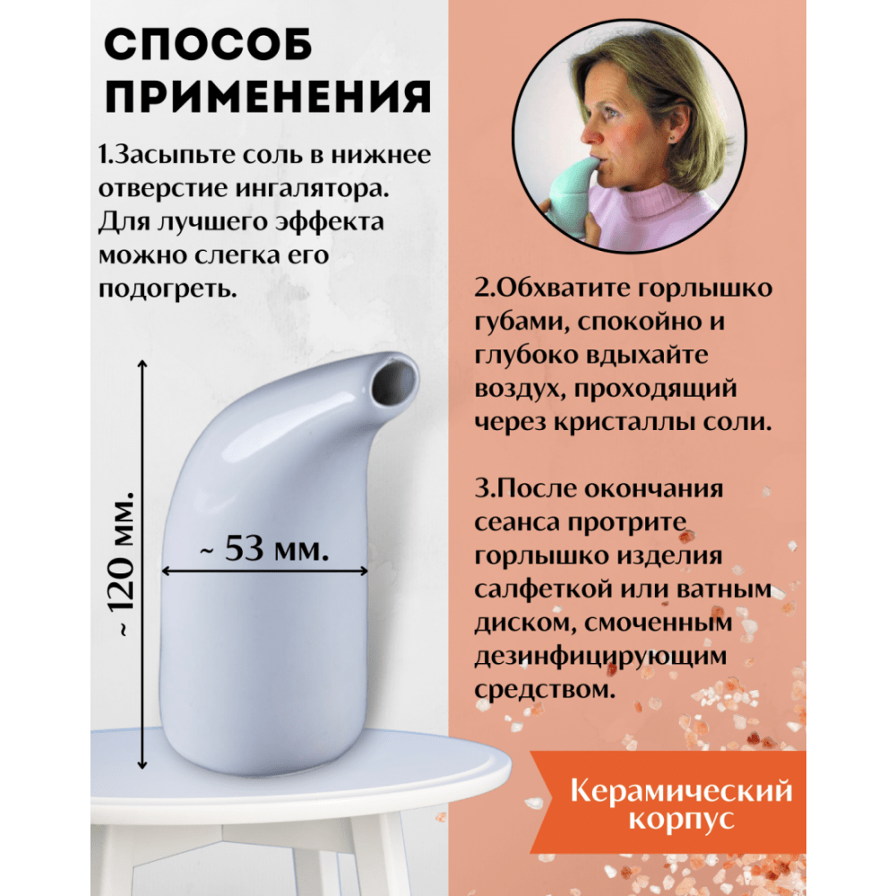 Соляной ингалятор Wonder Life размер S белого цвета. Отличное средство для профилактики заболеваний дыхательных путей и общего оздоровления организма. Материал засыпки – чистейшая целебная розовая гималайская соль из Пакистана. Качество и происхождение соли подтверждено сертификатами. Солевые ингаляторы Wonder Life – простая и удобная альтернатива дорогим соляным пещерам. Воспользуйтесь возможностью дышать морским воздухом всей семьей круглый год прямо у вас дома. Компактное керамическое устройство с кристаллами экологически чистой розовой гималайской соли внутри через ингаляцию благотворно влияет на весь организм человека. Из ингалятора мельчайшие частицы соли попадают в дыхательные пути и оказывают восстанавливающее и очищающее воздействие. Происходит природная стерилизация воздуха в легких, а организм насыщается чистым целебным воздухом. По сути это знаменитая и широко применяемая на курортах солевая пещера, но в миниатюре, у вас дома и всегда у вас под рукой. Это удобно, просто и доступно по цене. Солевой ингалятор можно применять как взрослым так и детям, его рекомендуют использовать после учебы, работы и общественного транспорта для общего оздоровления круглый год и для профилактики простуды и ОРВИ в период эпидемий. Солевой ингалятор прост в использовании и уже готов к работе. Его не нужно настраивать, он не требует электричества, он не шумит и не требует дополнительных затрат на закуп аптечных препаратов для ингаляции. Срок службы до 7 лет. Возьмите силы природы в свои руки. Сохраните свое здоровье и долголетие. Закажите солевой ингалятор для себя и своих близких.