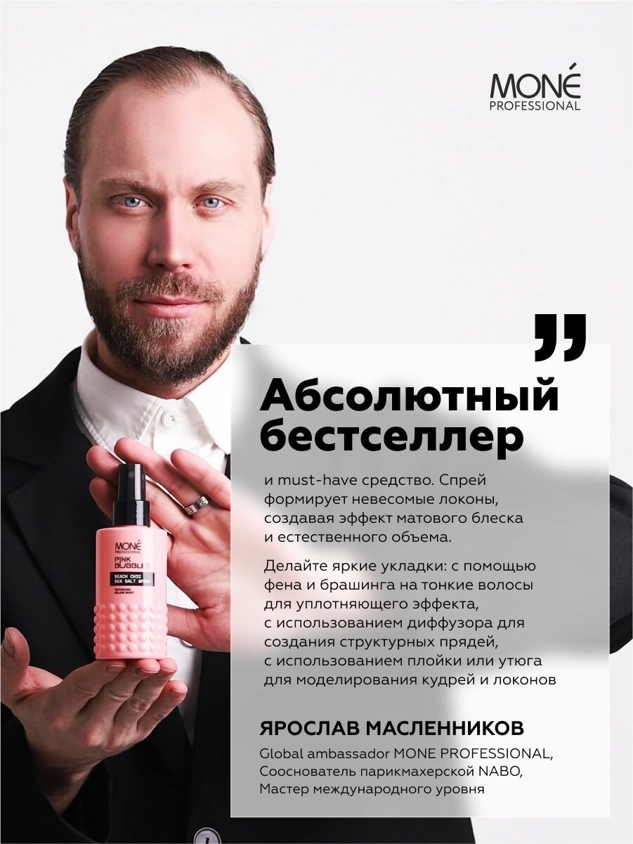 Текстурирующий спрей с морской солью - идеальная находка для тех, кто мечтает о непринужденных объемных укладках! Специально разработан для стайлинга в пляжном стиле. Формирует локоны, создавая эффект матового блеска и естественного объема. Является незаменимым средством для креативных укладок своими руками, которые требуют объем у корней и фиксации локонов. Придает волосам нежный аромат, который создает настроение на целый день. Необычная упаковка оставляет приятные тактильные ощущения. Спрей стал бестселлером у клиентов и must-have средством у наших стилистов. Не склеивает и не утяжеляет волосы, создавая эффект “порыва ветра” в волосах Формула разработана в Италии для MONE PROFESSIONAL.