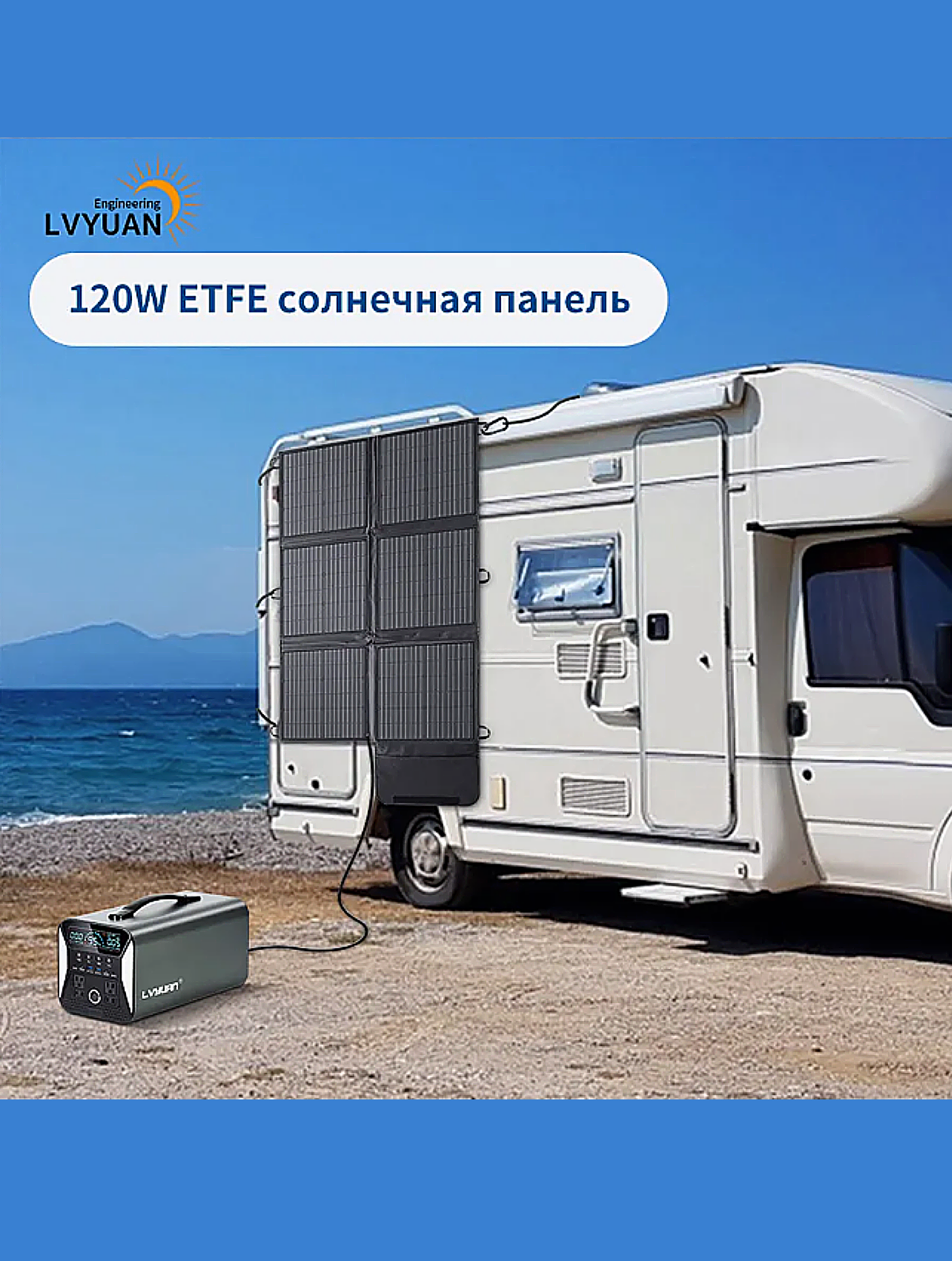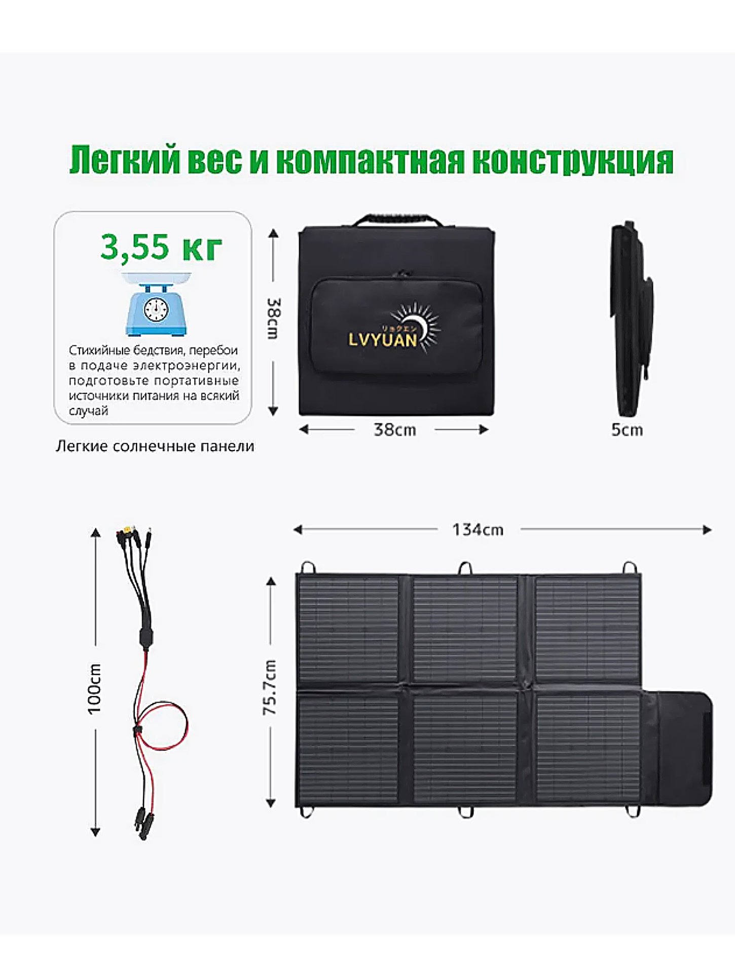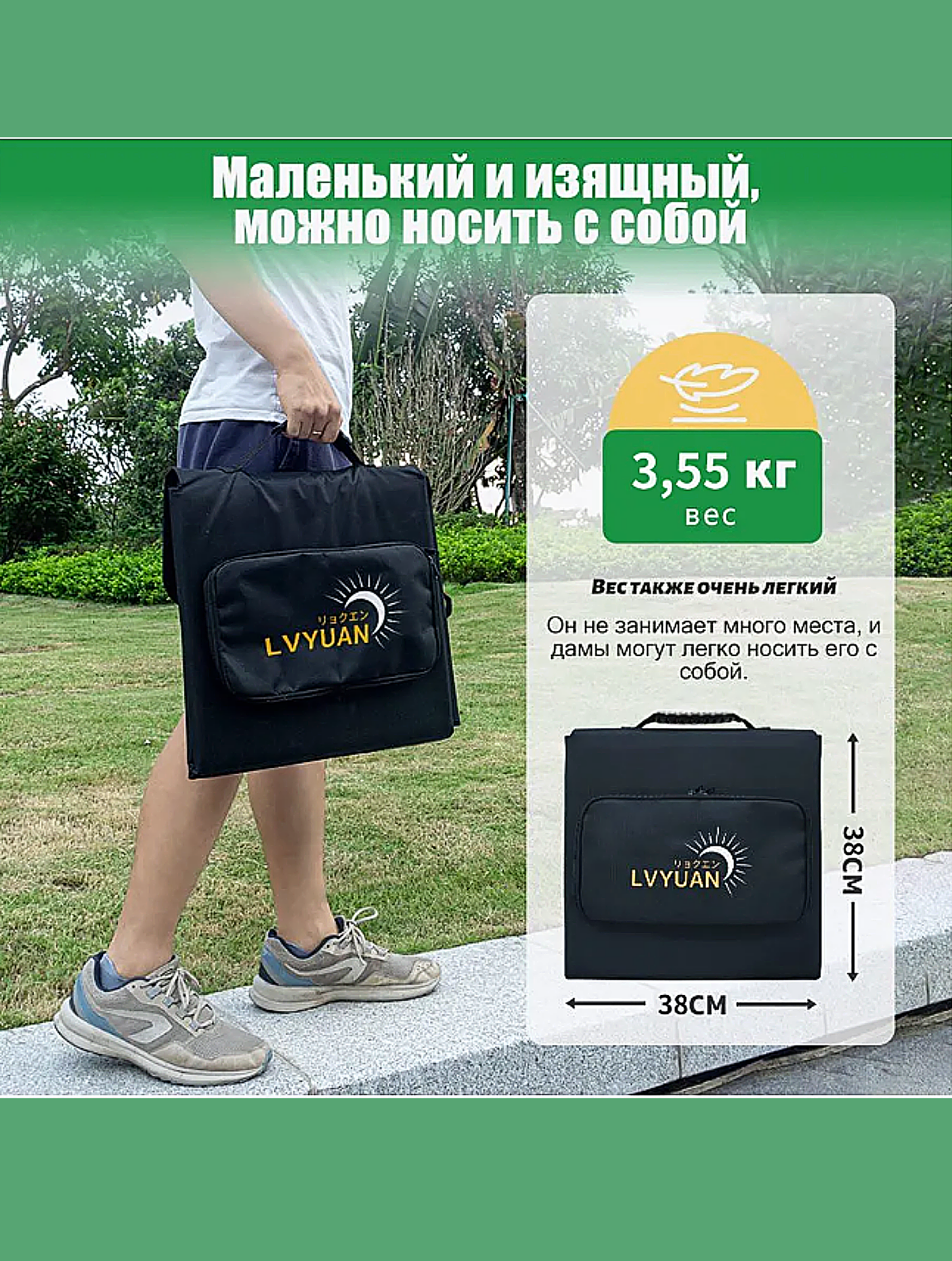 "Солнечная батарея портативная складная панель Lvyuan 120 Вт 20В" от бренда Lvyuan - это идеальное решение для активного отдыха и кемпинга. Состоит из 6 солнечных панелей из высококачественного монокристаллического кремния, что обеспечивает высокую эффективность преобразования энергии до 22,5%.