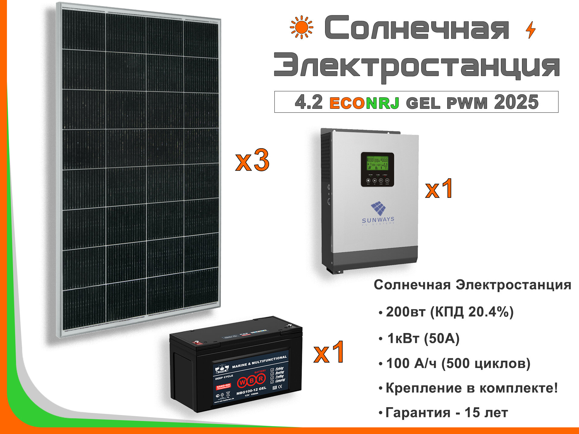 Солнечная электростанция ECONRJ 4,2 кВт*ч в сутки GEL PWM 2025 моно: сравнение цен, характеристики, фото, актуальное наличие и цены.