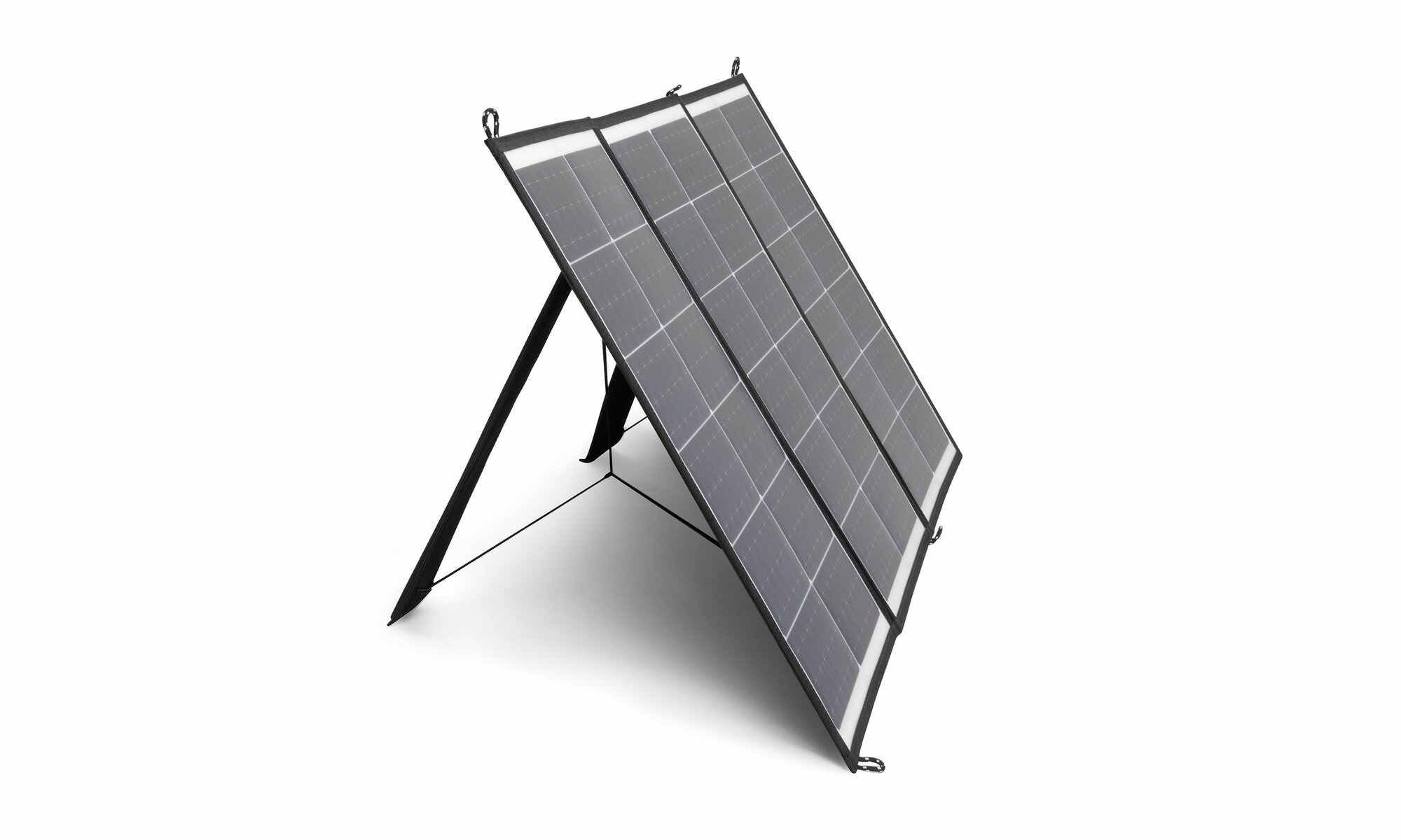 Портативная складная солнечная панель с 3 монокристаллическими блоками солнечных батарей общей мощностью 120W. Каждый блок имеет защитный слой из полиэтилена и вшит в прочный чехол-корпус из полиэстера Oxford 600D с влагозащитным покрытием, а монокристаллические панели покрыты суперпрозрачной защитной пленкой из TPU. Чехол удобно складывается и имеет форм-фактор сумки с ручкой. На блоках предусмотрены дополнительные петли и подставки для удобного размещения и крепления в развернутом виде. На клапане установлены полуавтоматические застёжки фастекс, которые предотвращают случайное открытие солнечной панели во время транспортировки.
