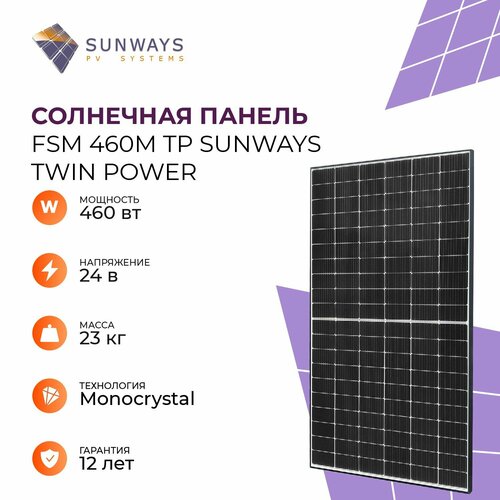 Солнечная панель премиум класса Sunways FSM 460M TP (Twin power)- это новое поколение солнечных батарей, выполненных по передовой технологии Half cell PERC. Благодаря использованию последних технологий, эффективность солнечных панелей Sunways FSM TP превышает 21%! По сравнению со стандартными солнечными батареями, наши Half cell модули более эффективны, имеют большую выработку и меньше перегреваются в условиях частичного затенения. Также эти модули лучше работают в случае повреждений, чем стандартные солнечные панели. Солнечная панель изготовлена из высокоэффективных монокристаллических солнечных элементов первой категории качества Grade A, что гарантирует повышенную производительность и надежность модуля. В процессе производства используются только высококачественные и сертифицированные компоненты производителей с мировым именем и многолетним опытом работы в области солнечной энергетики.